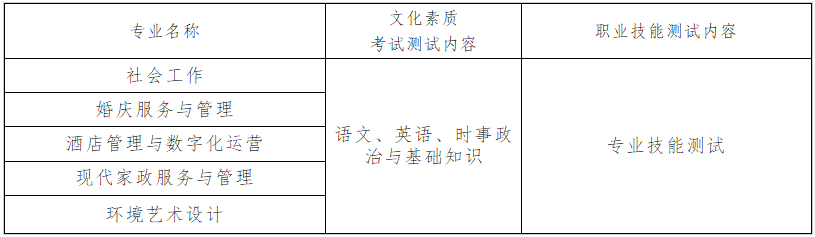 第十四条 此次高职单独招生考试采取“文化素质+职业技能测试”的模式,考试时间4月6日(其中文化素质测试时间为9:00—12:00,职业技能测试时间以准考证为准)。各专业考试方式具体见下表。