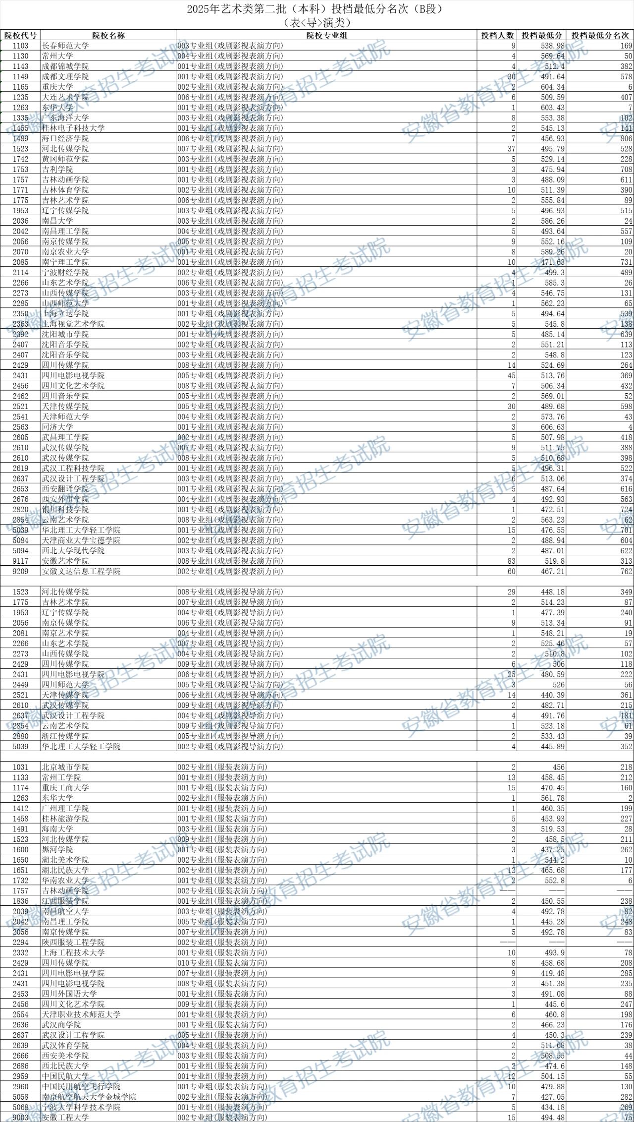 安徽2025年艺术类第二批(本科)投档最低分名次(B段)(表<导>演类)