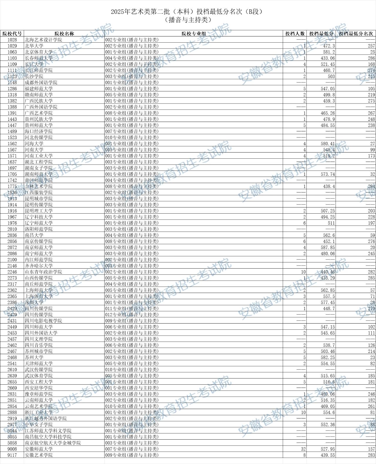 安徽2025年艺术类第二批(本科)投档最低分名次(B段)(播音与主持类)已公布,具体内容如下: