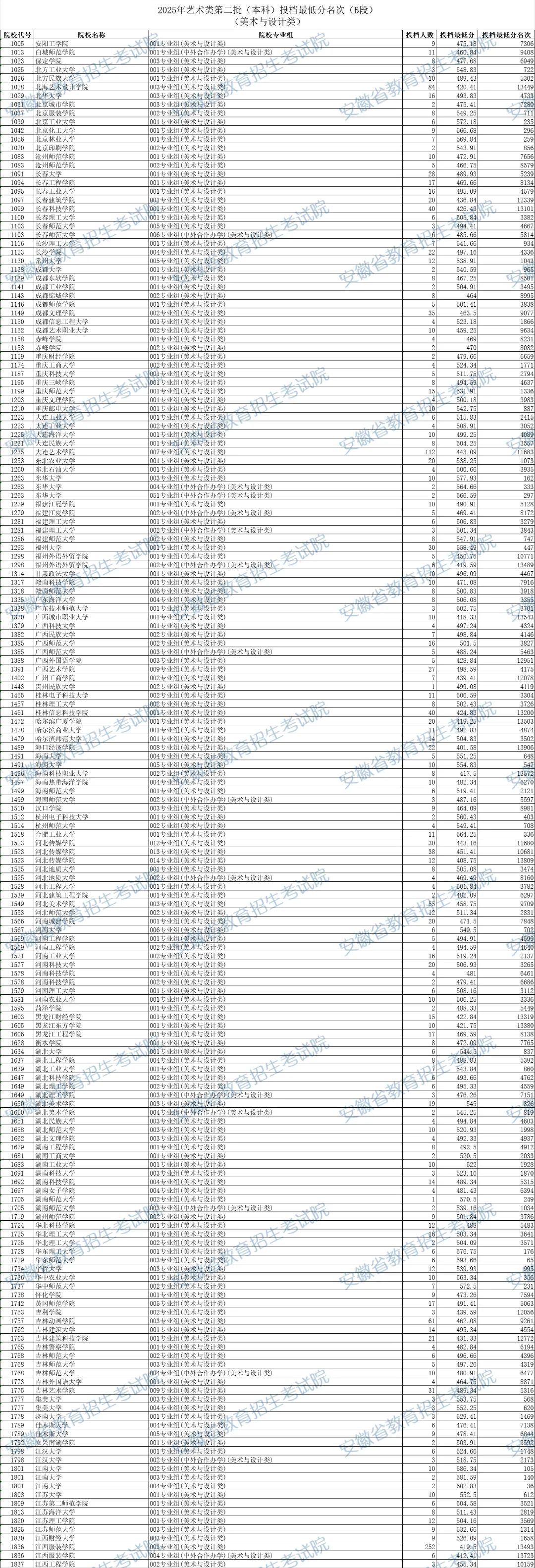 安徽2025年艺术类第二批(本科)投档最低分名次(B段)(美术与设计类)