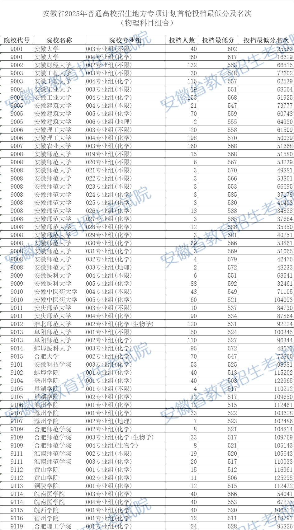 安徽省2025年地方专项计划首轮投档最低分及名次(物理科目组合)