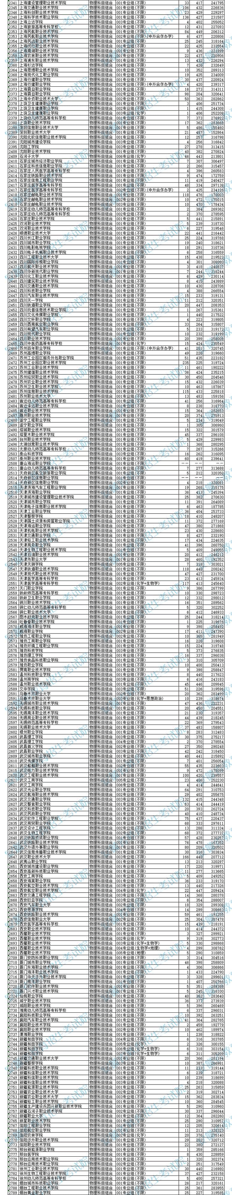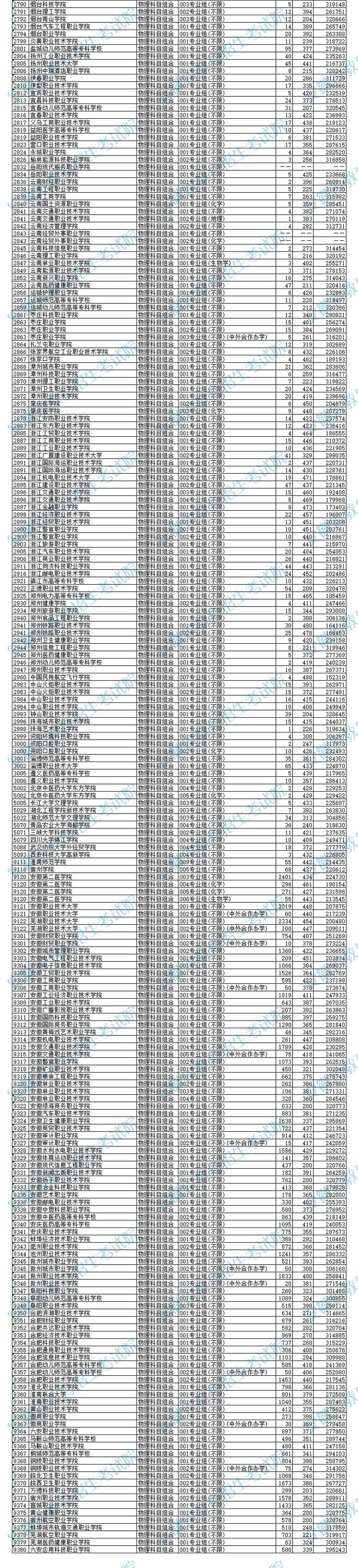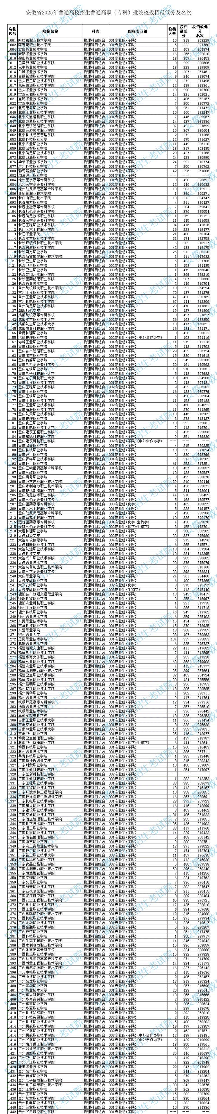 安徽省2025年普通高校招生普通高职(专科)批院校投档最低分及名次(物理科目组合)
