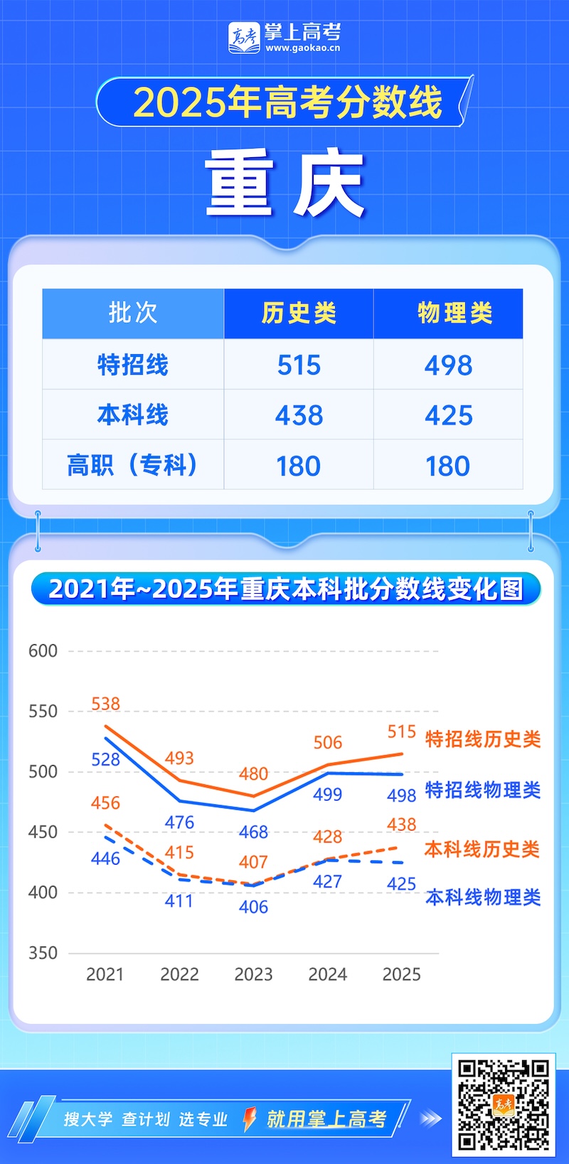 重庆市2025年高考录取分数线公布:历史类本科线438分、物理类本科线425分,较2024年相比,历史类本科线有提升,具体情况如下: