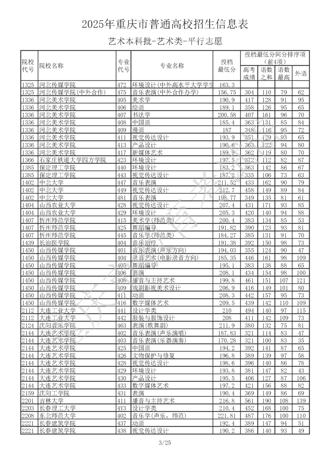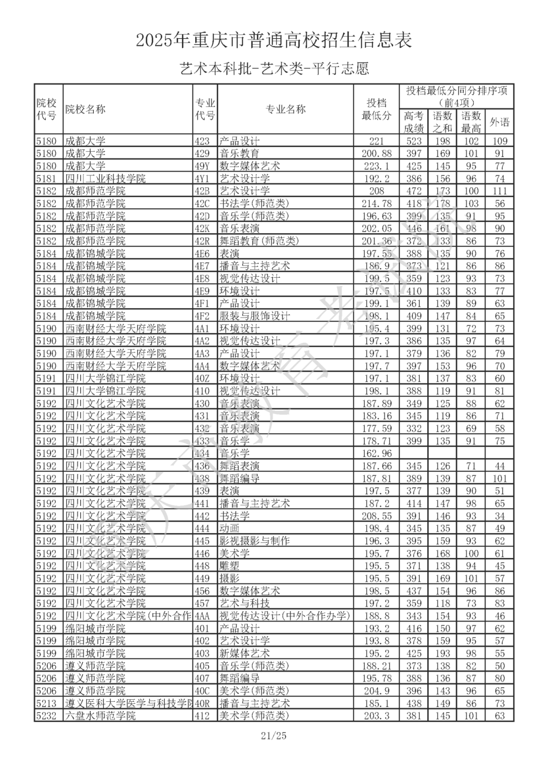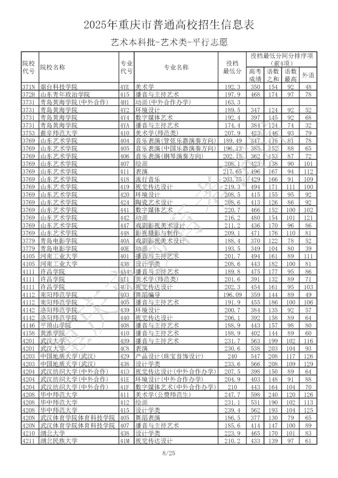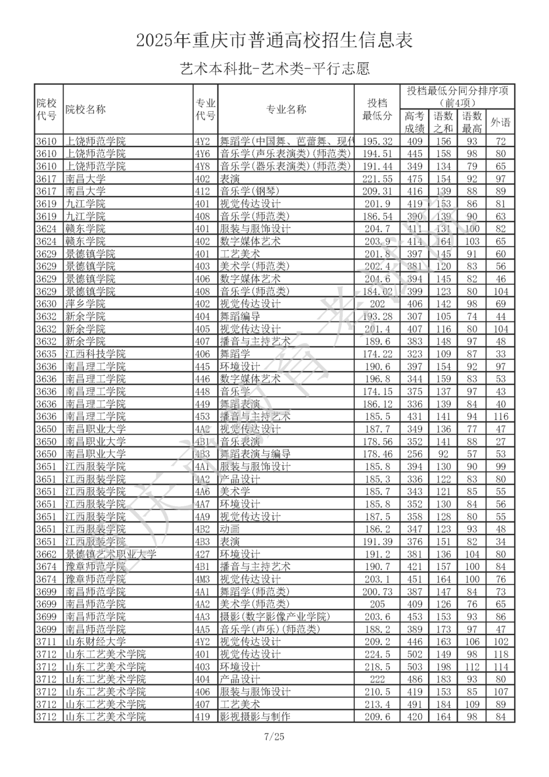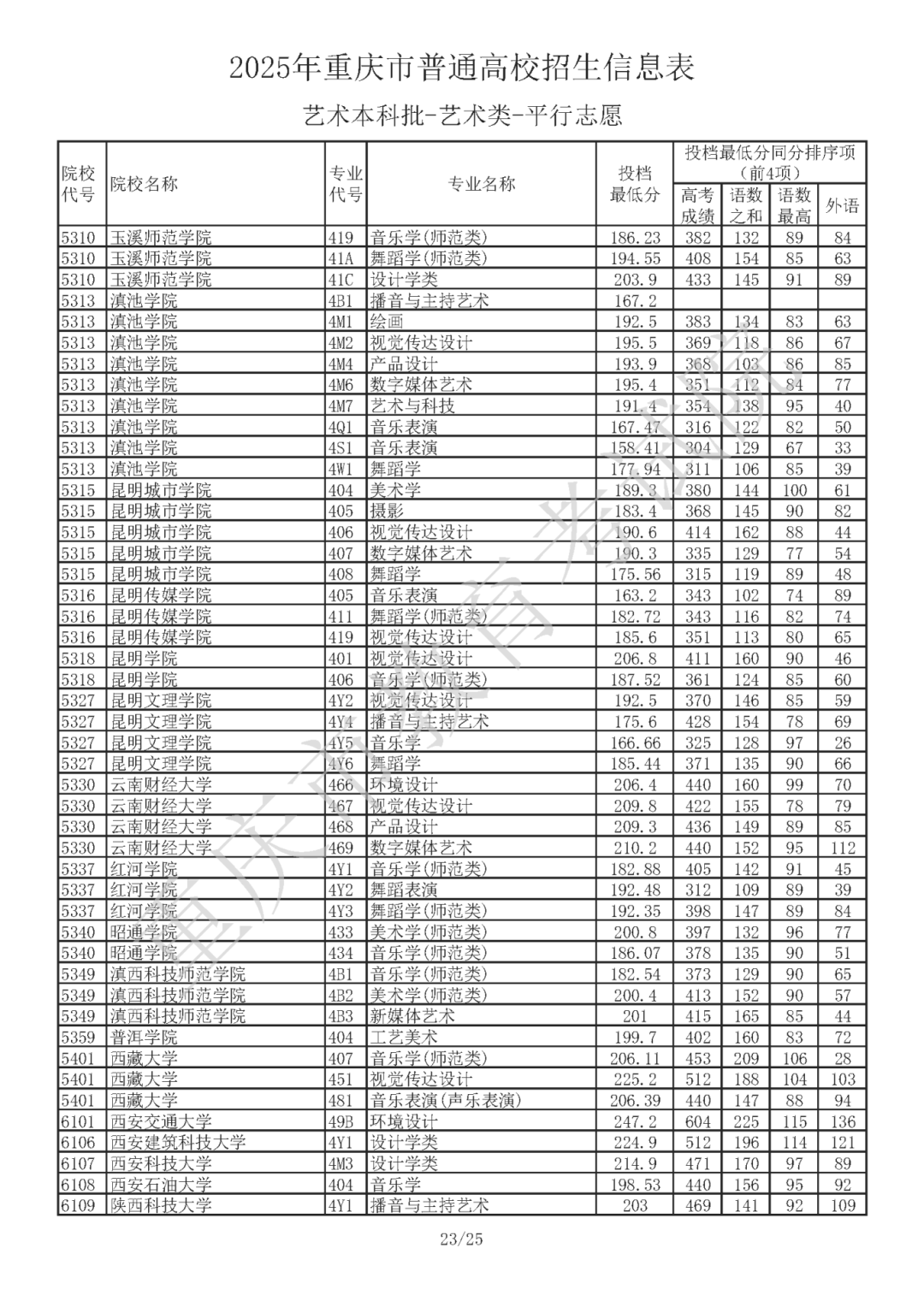 2025年重庆市普通高校招生信息表艺术本科批-艺术类-平行志愿信息已发布,具体内容如下: