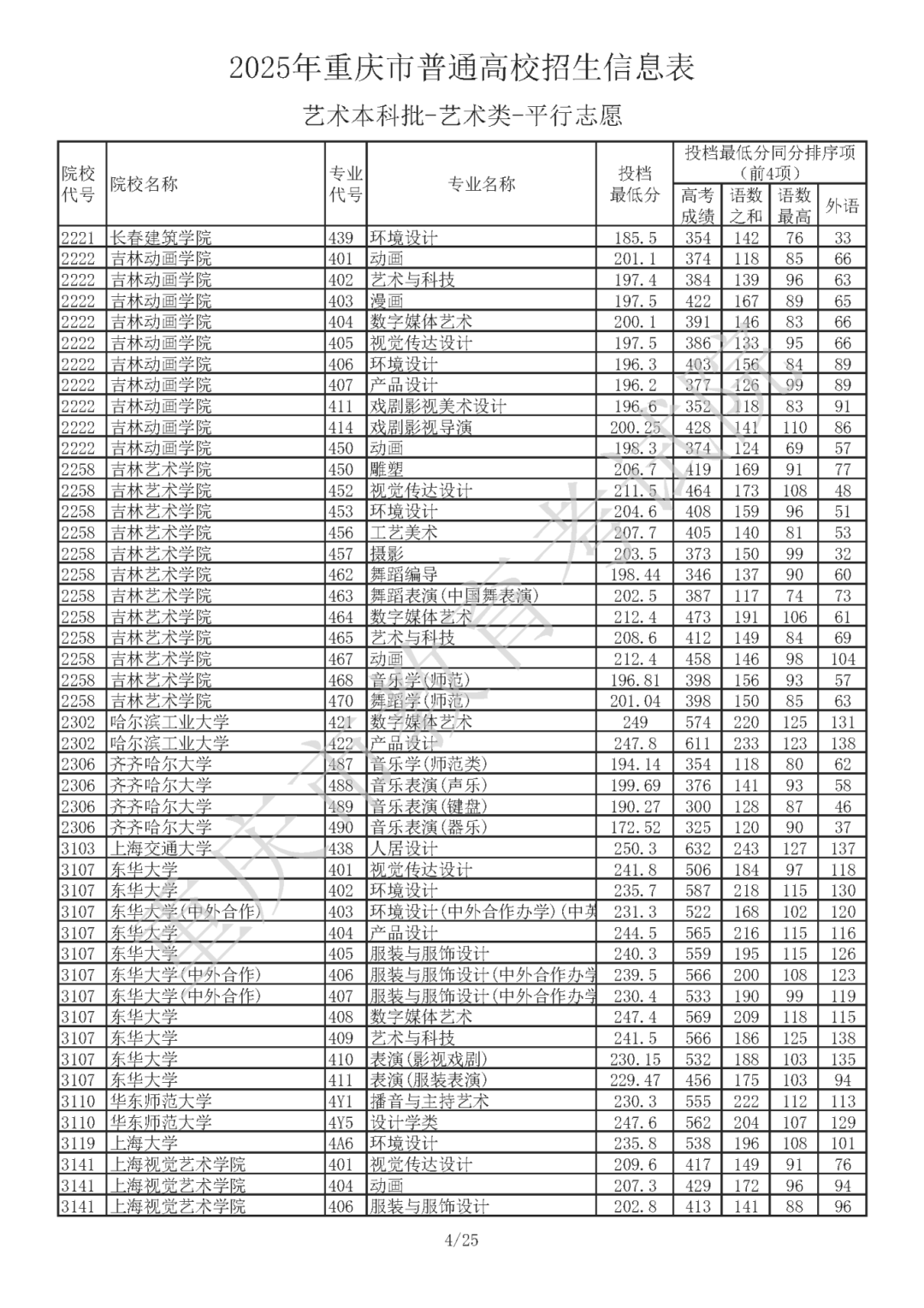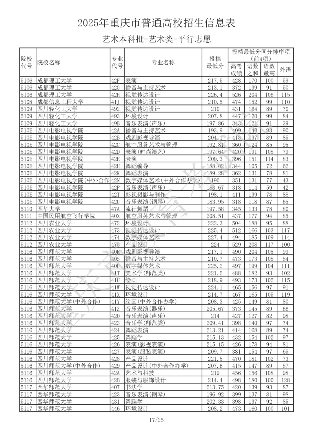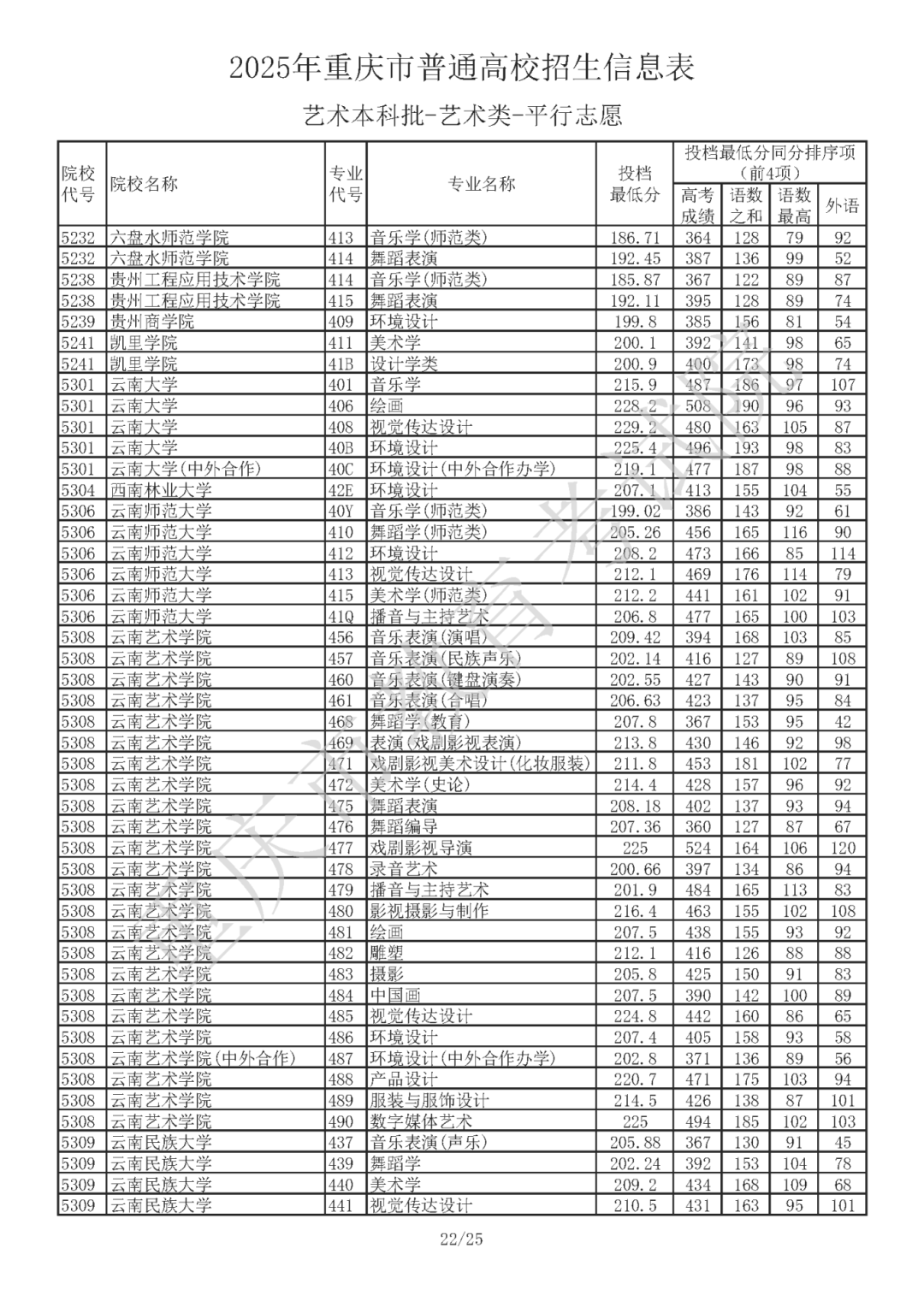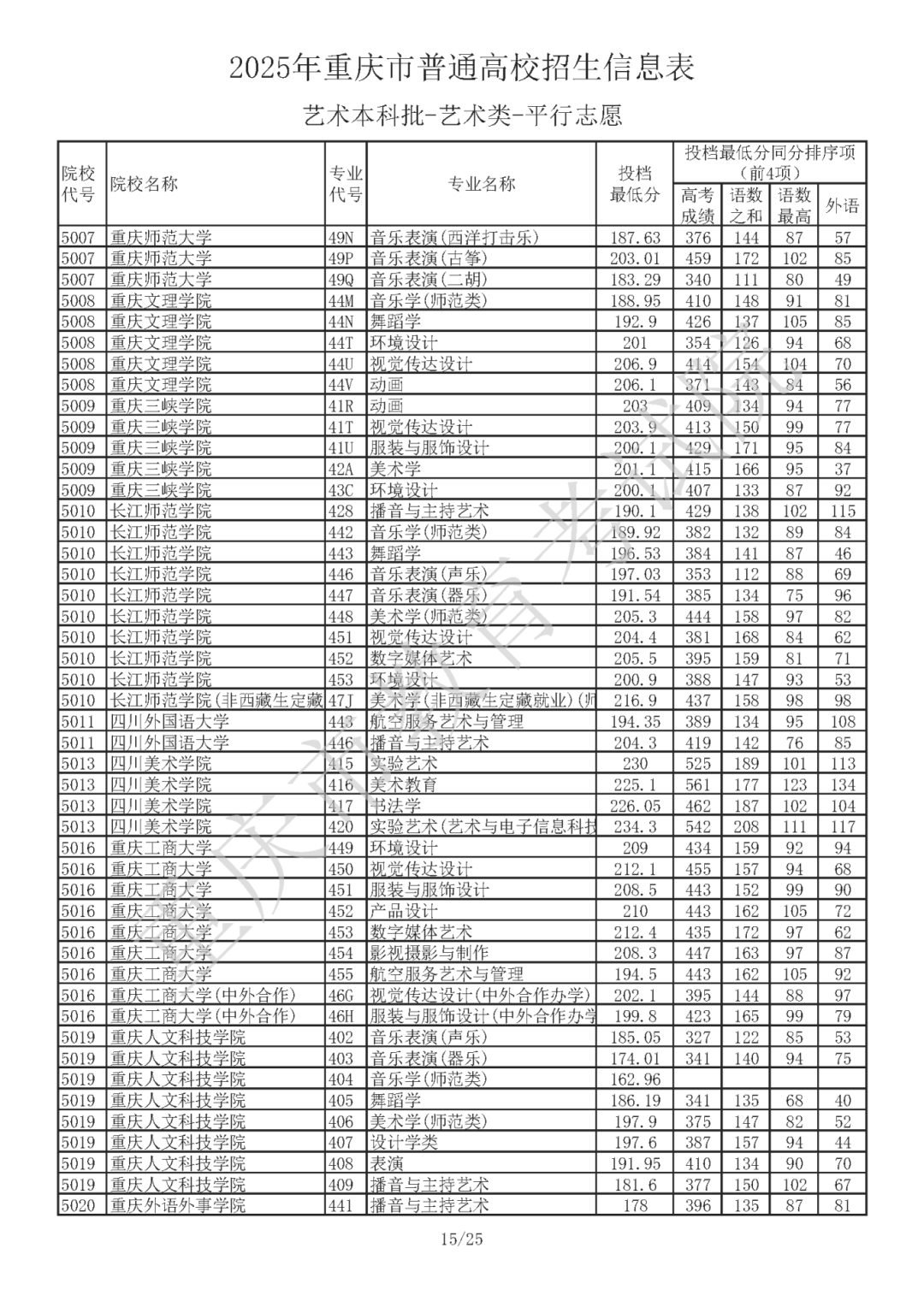 2025年重庆市普通高校招生信息表艺术本科批-艺术类-平行志愿信息已发布,具体内容如下: