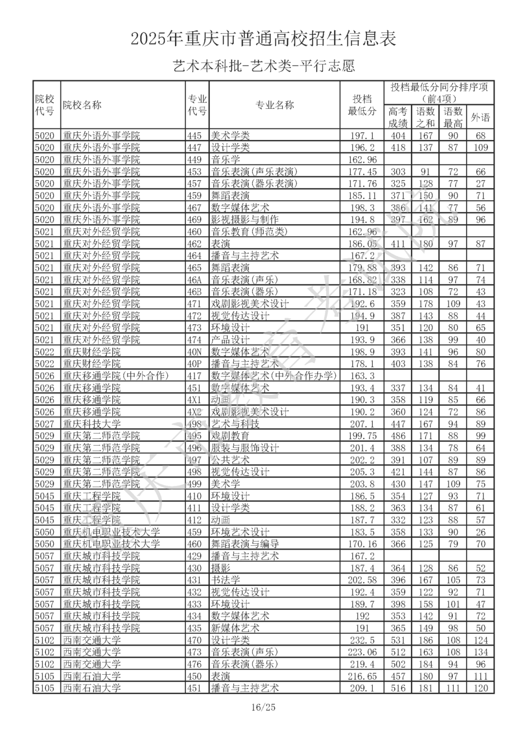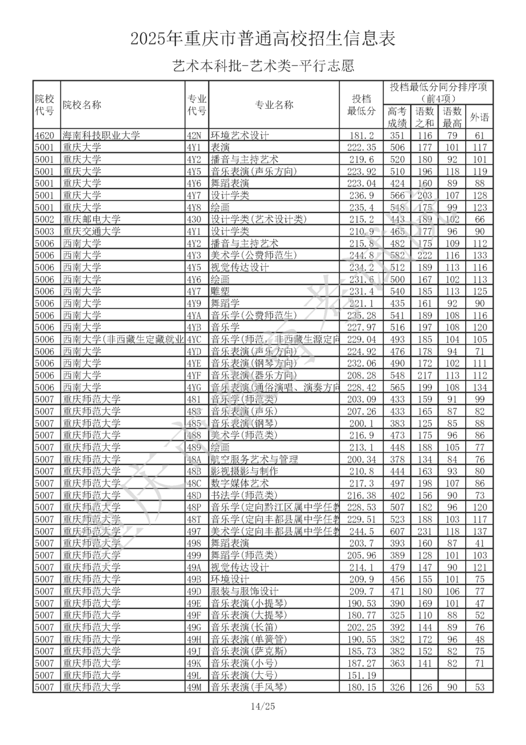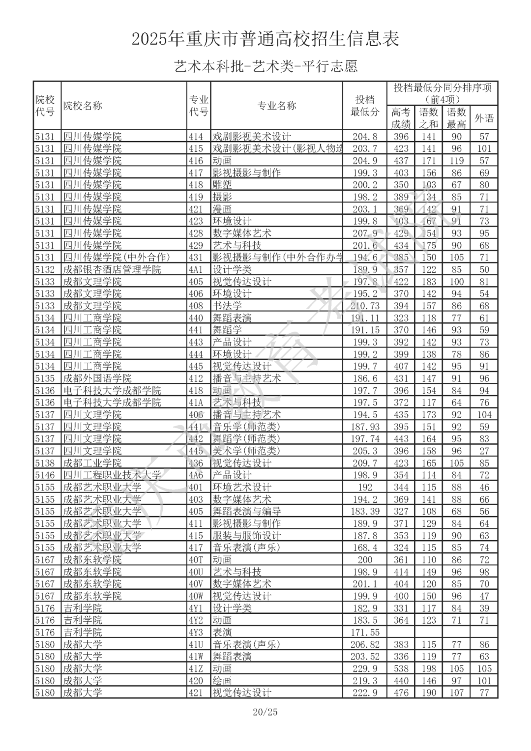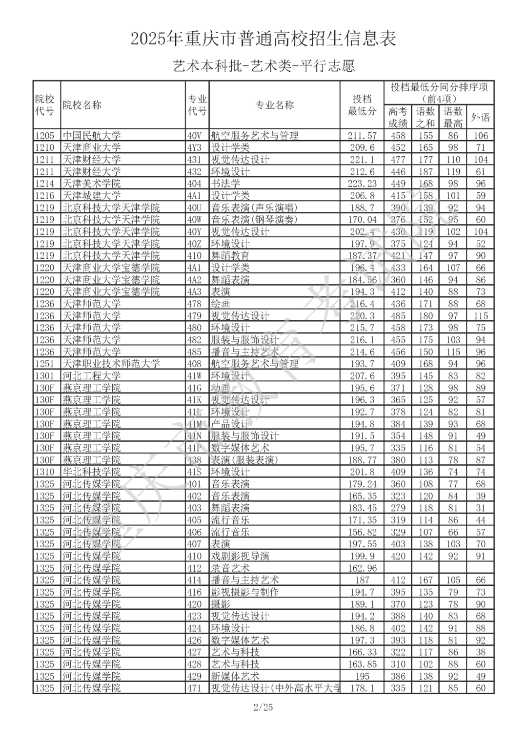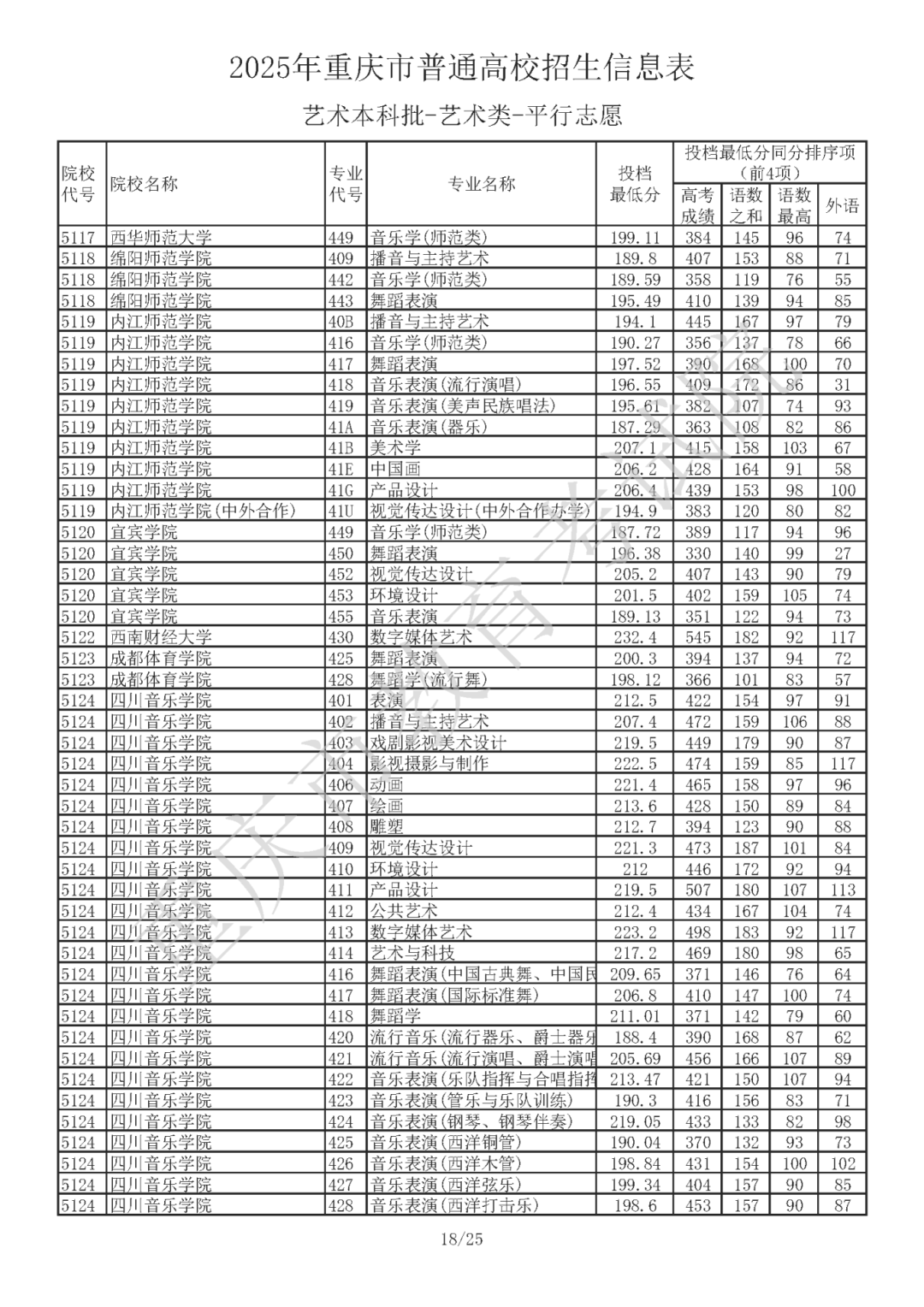 2025年重庆市普通高校招生信息表艺术本科批-艺术类-平行志愿信息已发布,具体内容如下: