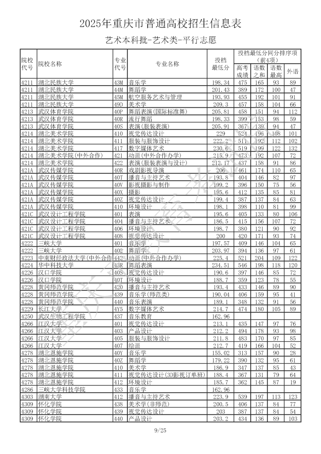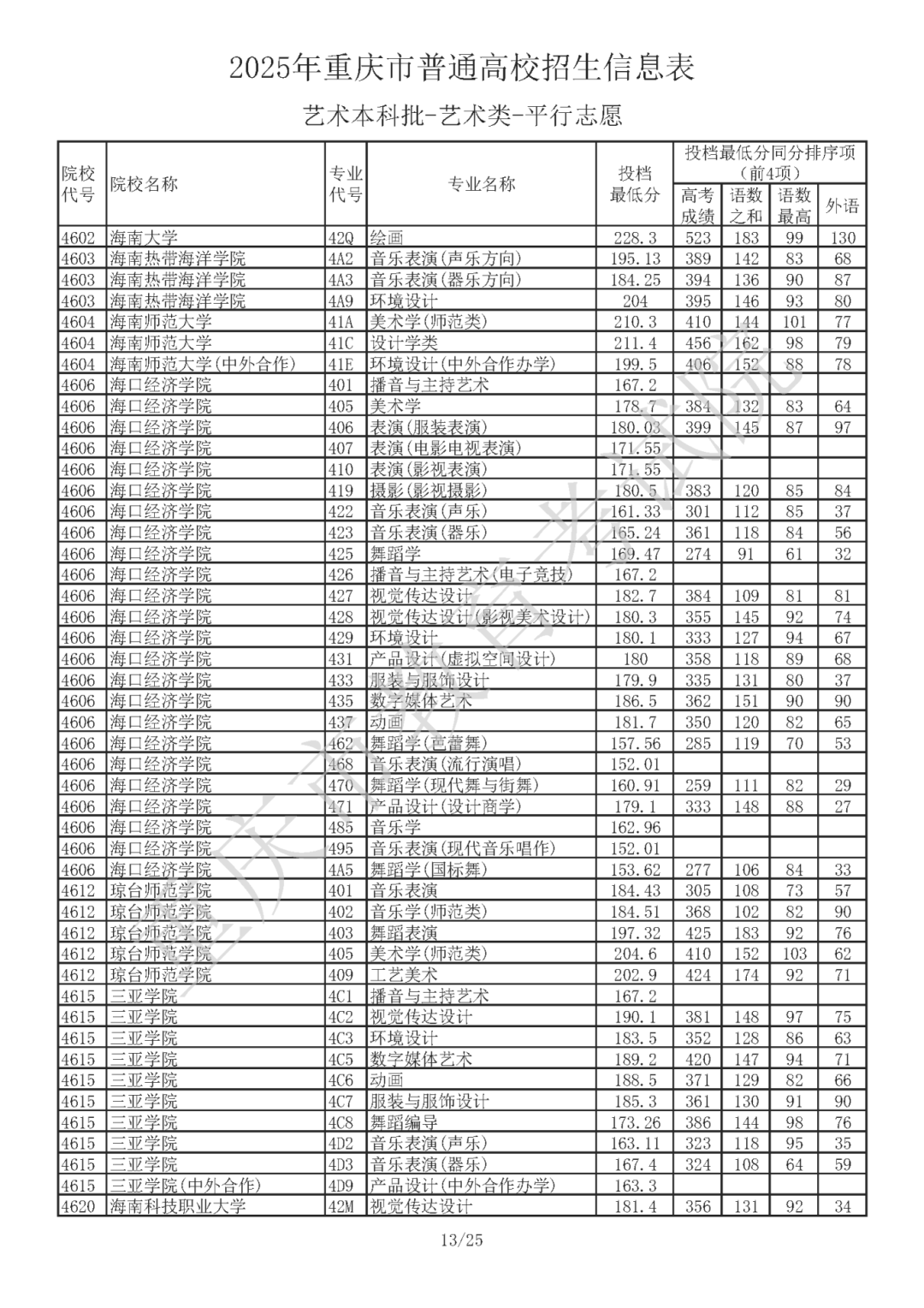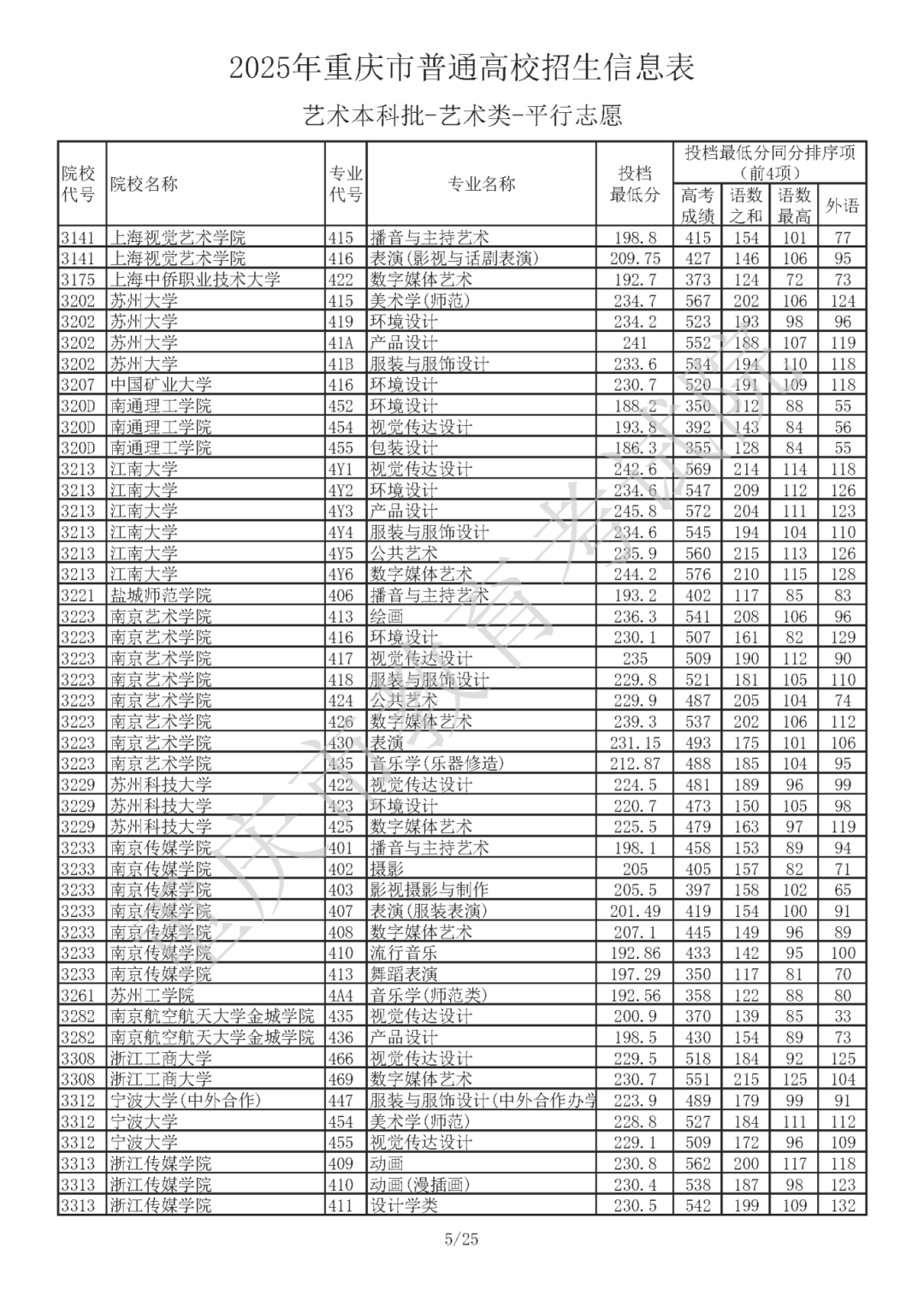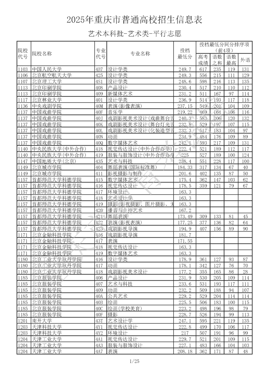 2025年重庆市普通高校招生信息表艺术本科批-艺术类-平行志愿信息已发布,具体内容如下: