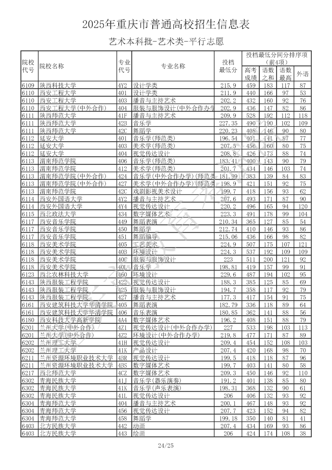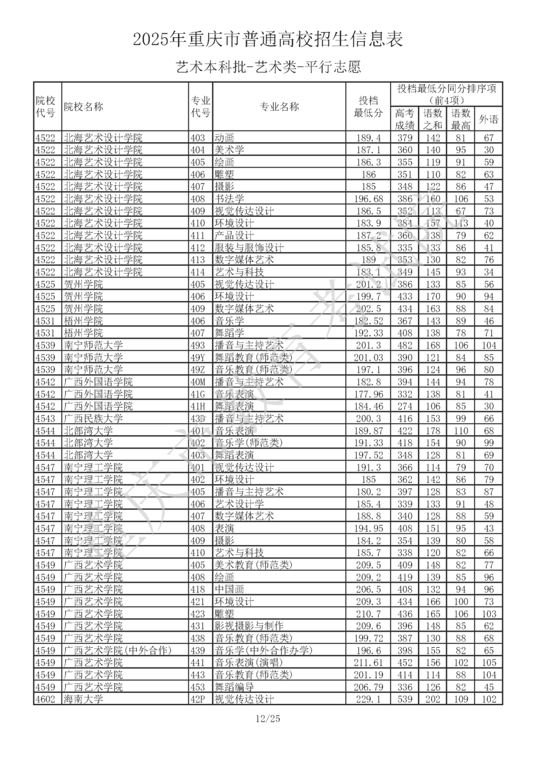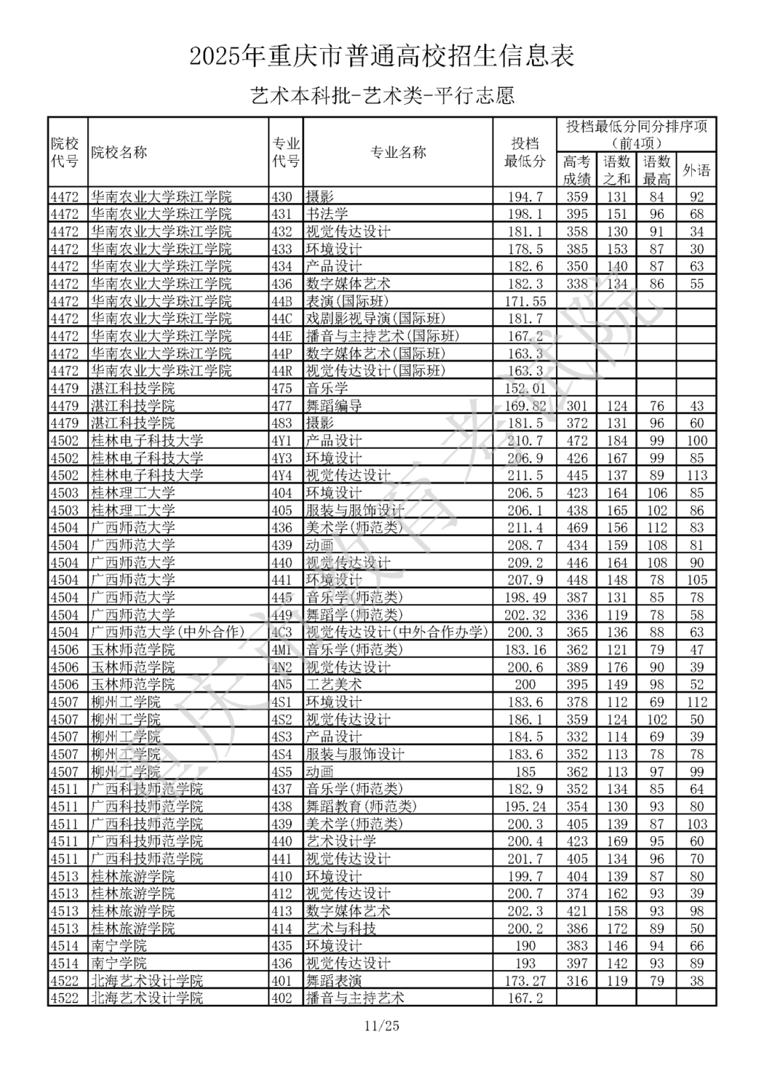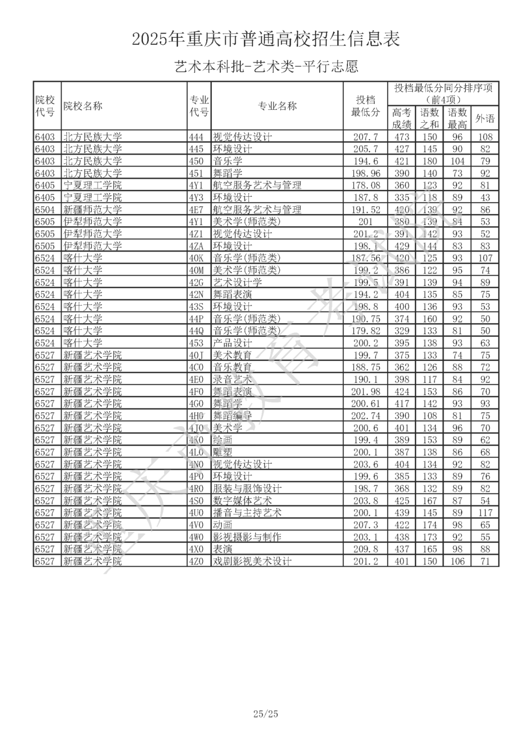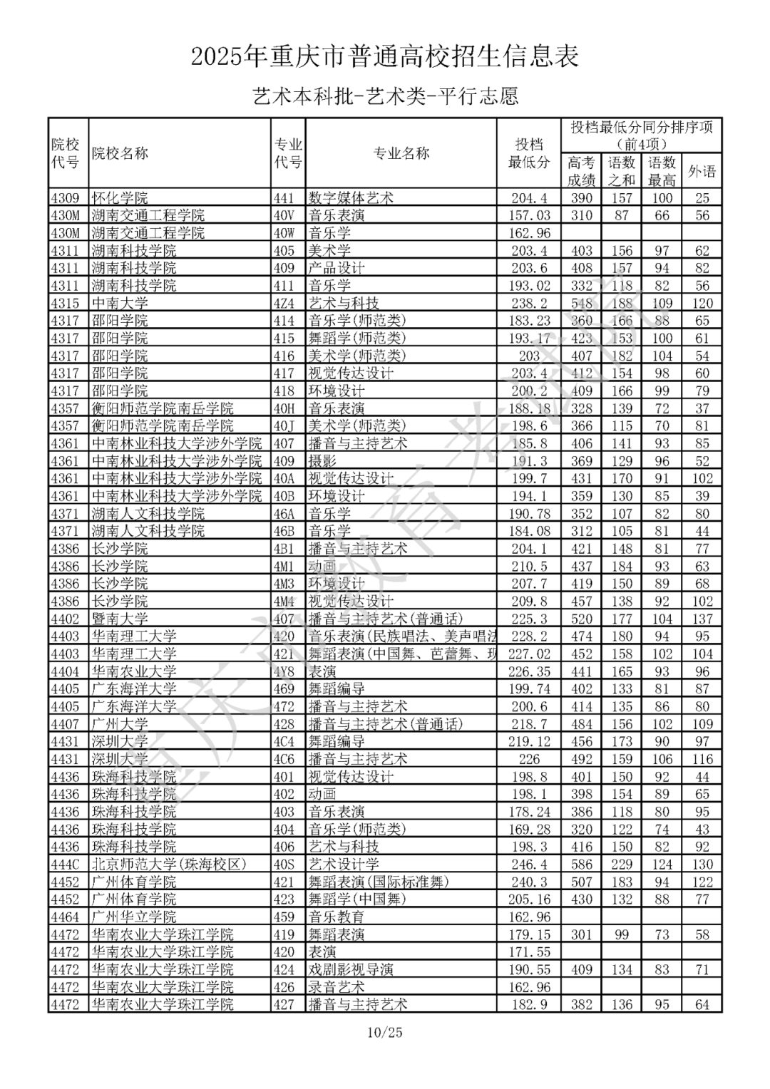 2025年重庆市普通高校招生信息表艺术本科批-艺术类-平行志愿信息已发布,具体内容如下: