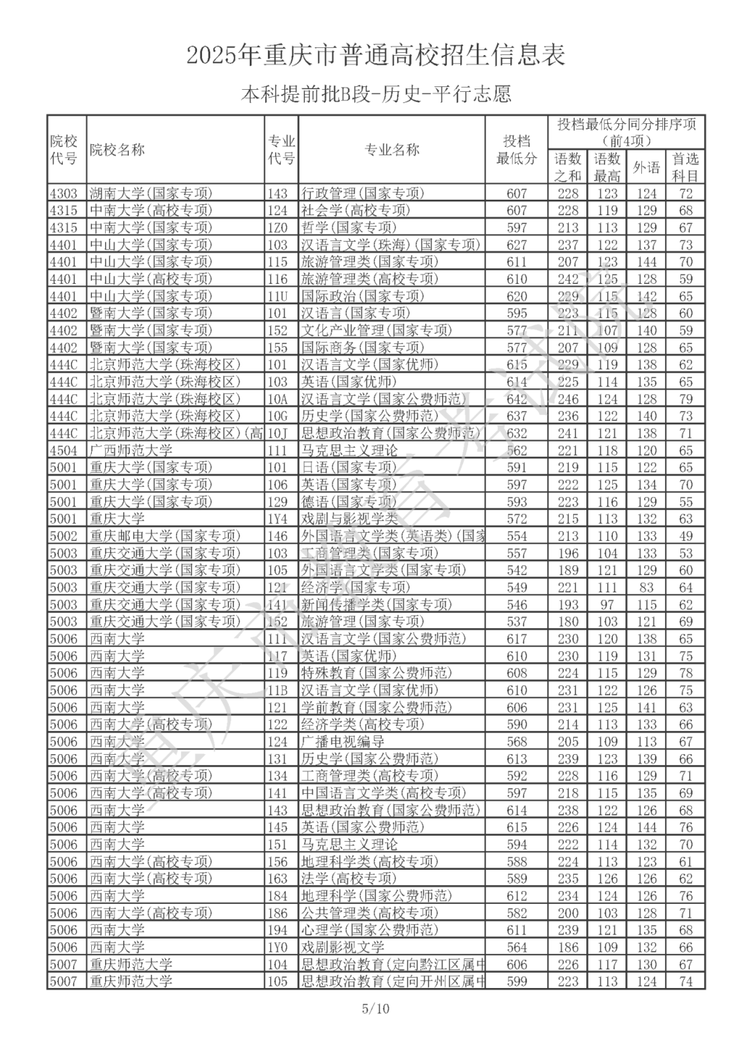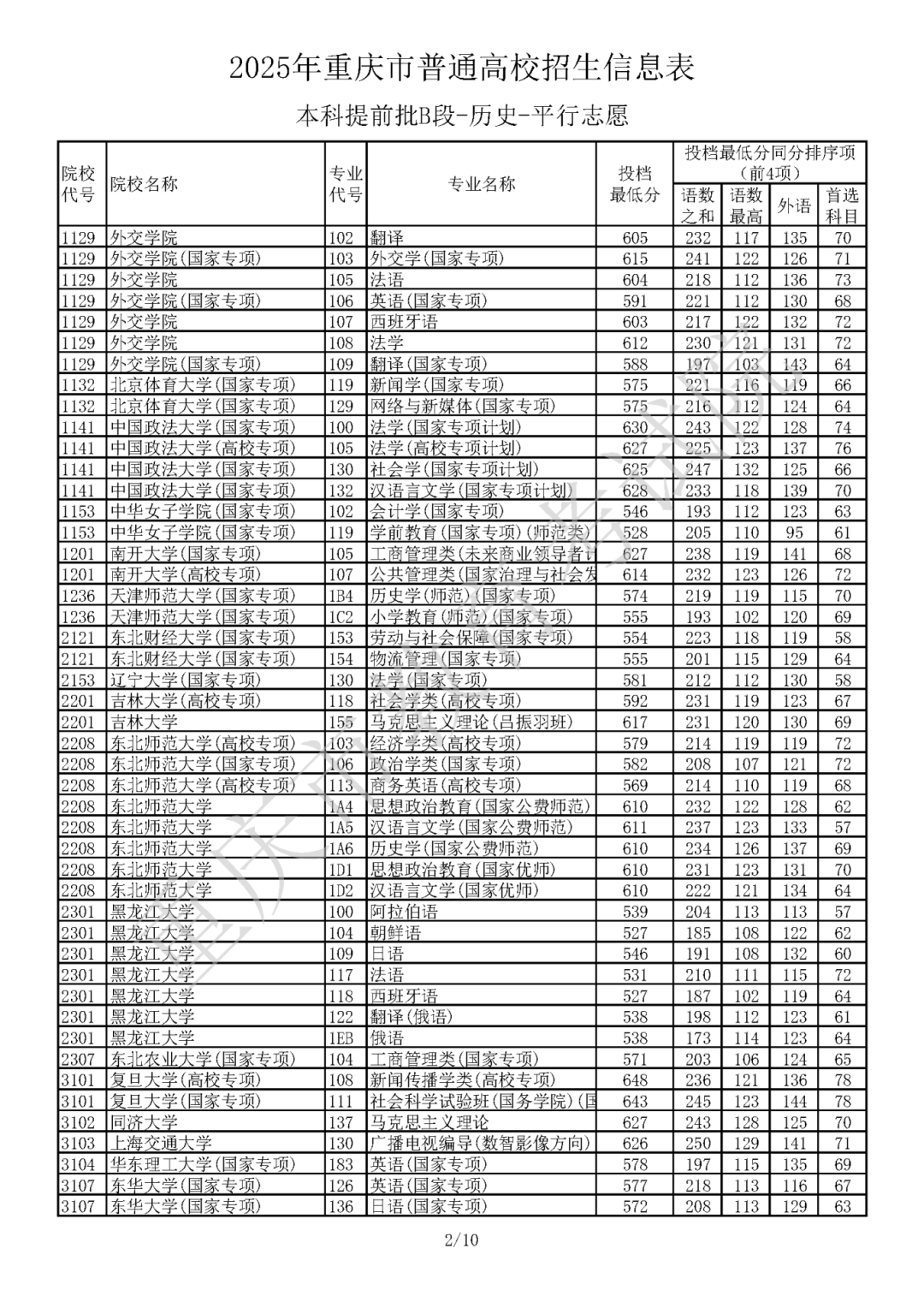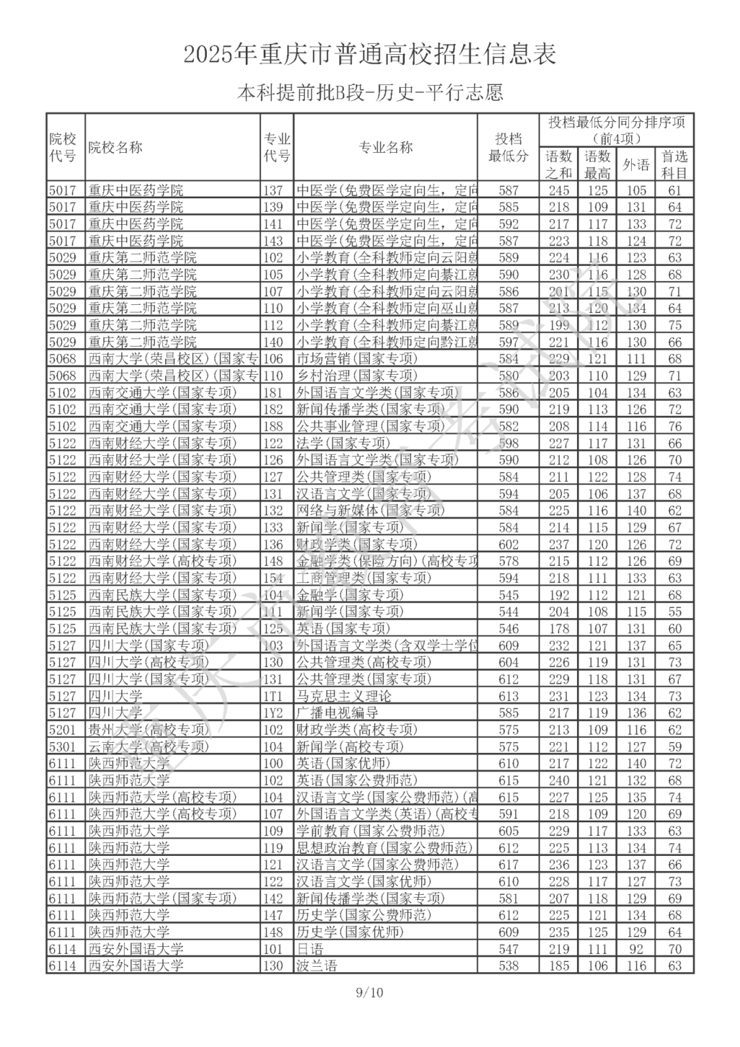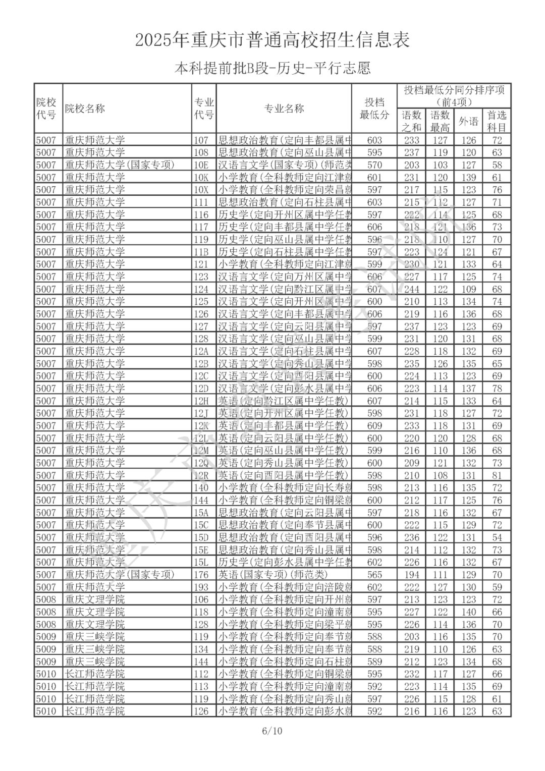 2025年重庆市普通高校招生信息表 普通类本科提前批B段(历史类)