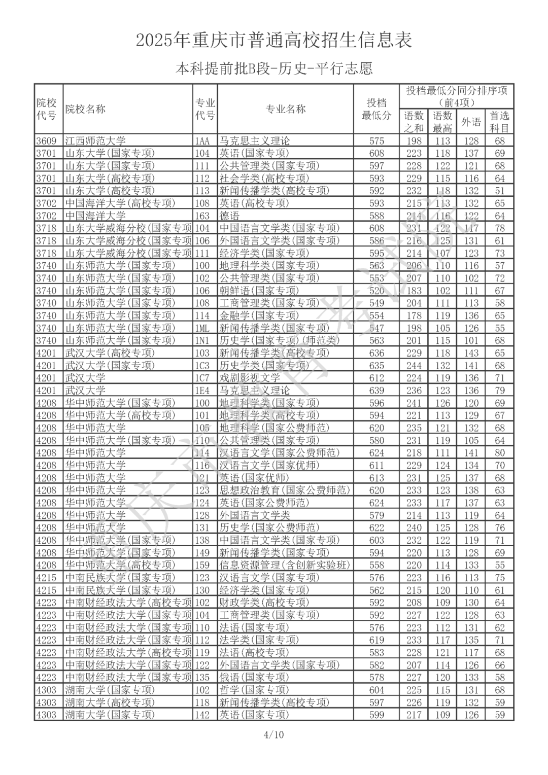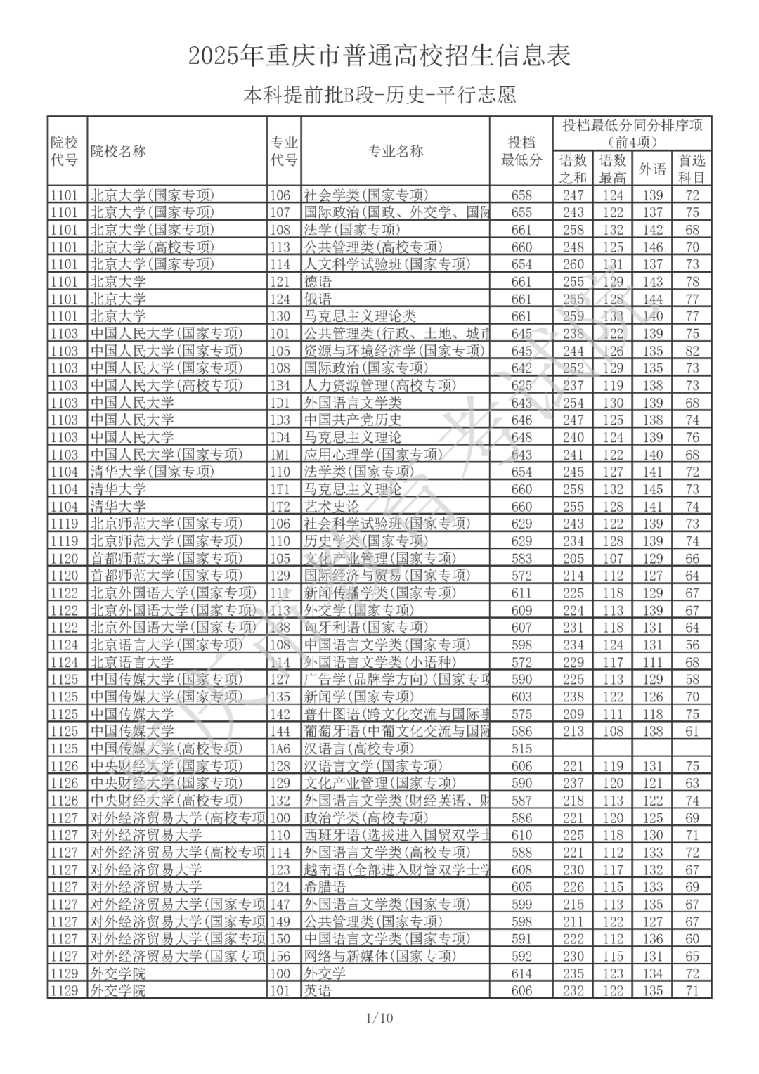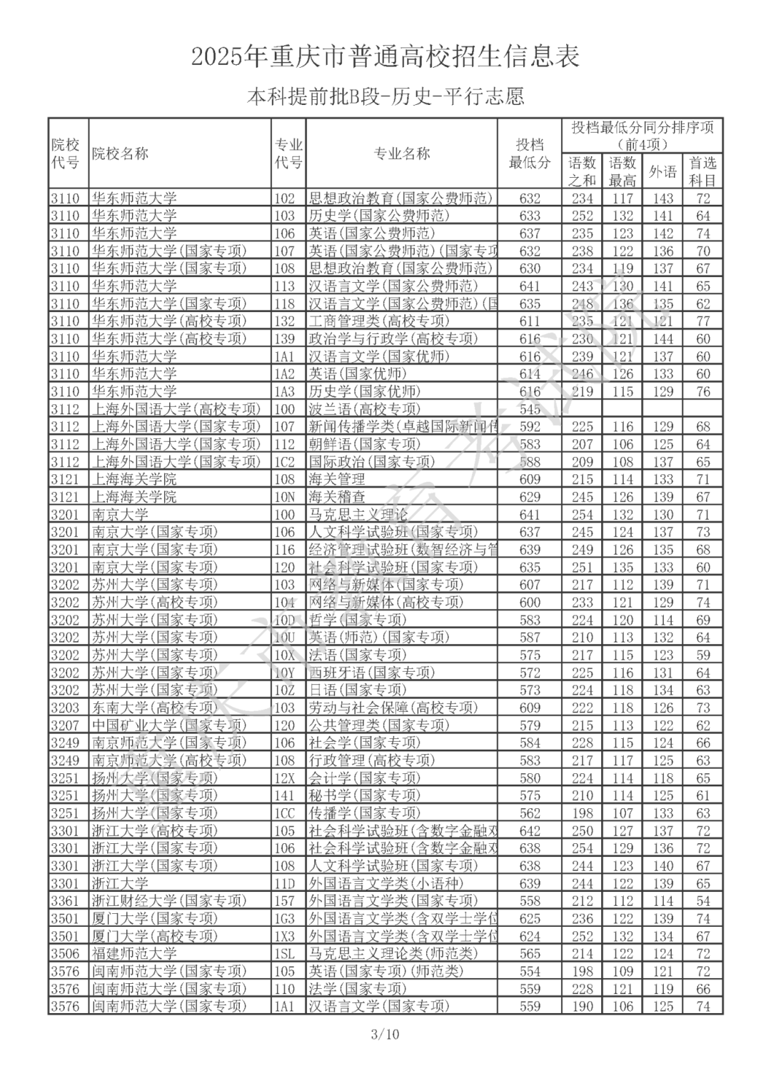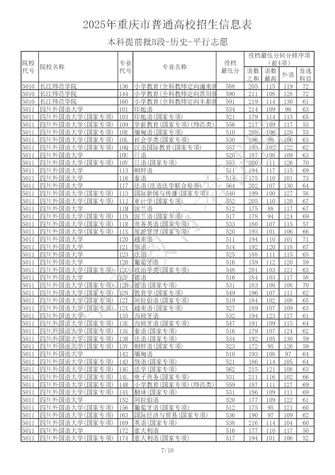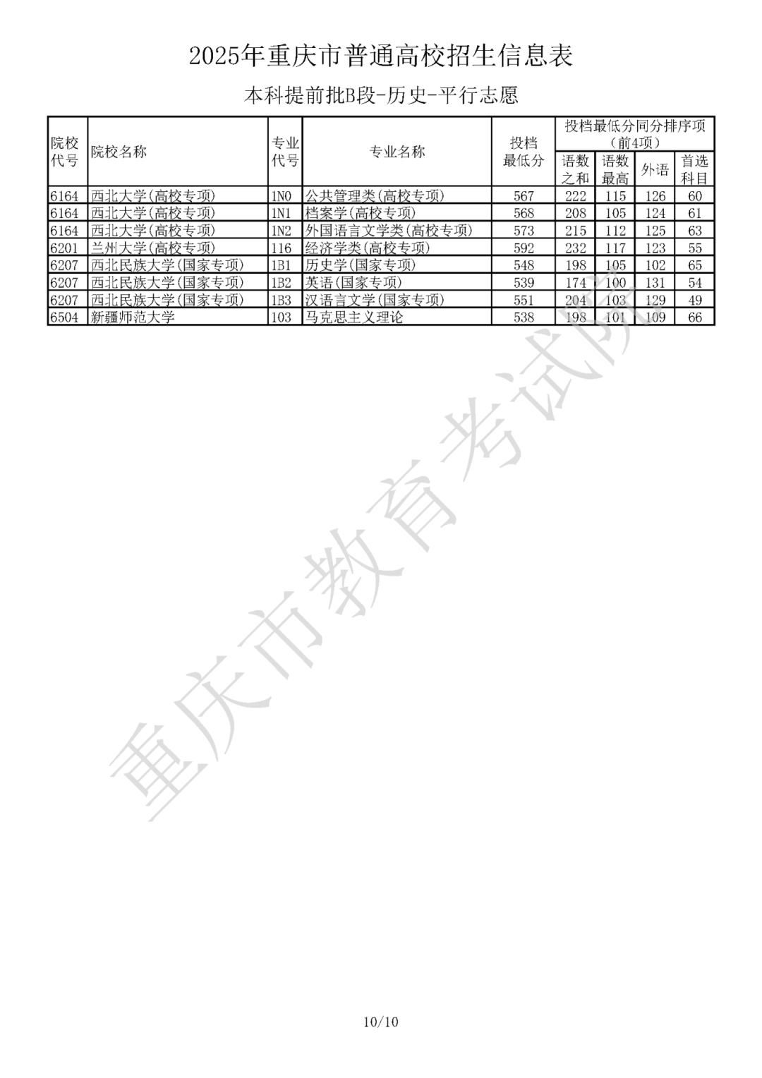 2025年重庆市普通高校招生信息表 普通类本科提前批B段(历史类)