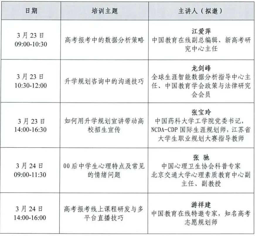 随着高考改革的不断深化,各高校和高中对于相关人员掌握考试政策、志愿填报、特殊类型招生等升学系统专业化知识,帮助高中生根据自身情况制定合理的升学规划的要求也逐渐提高。为提升相关从业人员的专业化素质和升学科学规划能力,中国高等教育培训中心联合中国教育在线,决定于2023年3月23日-3月24日在线举办“新高考升学规划师研修班(第二期)”。