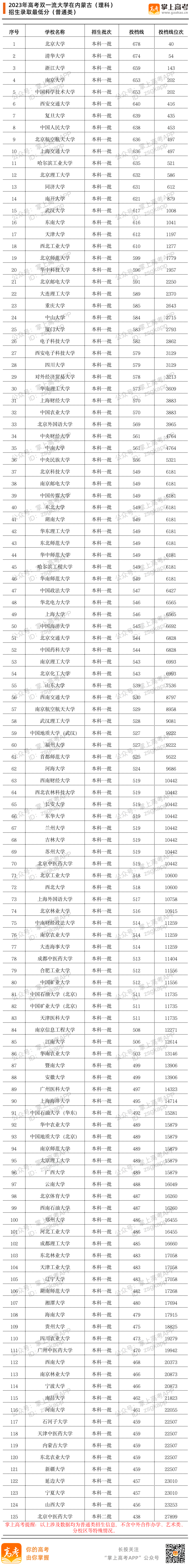 2023年双一流大学在内蒙古投档分数线汇总