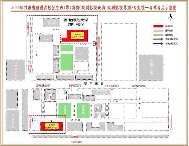 笔试考点设在西北师范大学云亭校区(地址:兰州市安宁区安宁东路967号),面试考点设在西北师范大学知行校区(地址:兰州市安宁区邱家湾37号)。