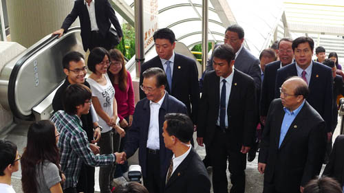 11月14日下午四时,澳大校董会主席谢志伟博士和校长赵伟教授在澳大正门迎接温家宝总理。随后,温家宝总理沿着澳大地标九龙壁石级缓缓步行走进校园,期待已久的年轻学子看到这位平民总理来了,都热情地鼓掌、欢呼,激动的心情洋溢在他们青春的脸上。