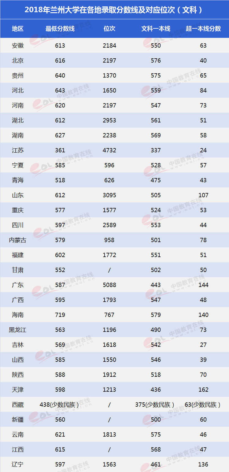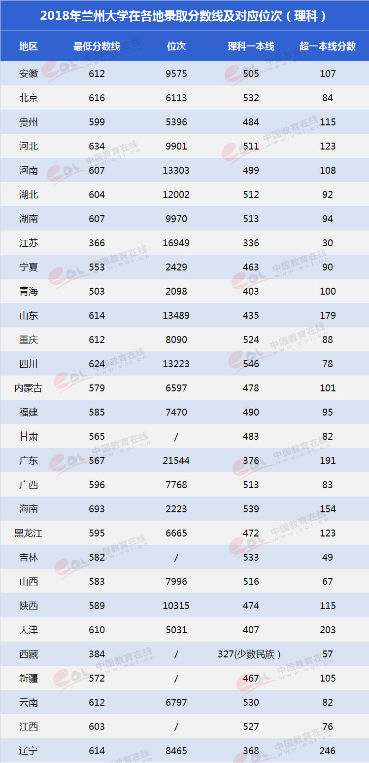 以下是中国教育在线整理的兰州大学2018年在各地录取最低分数线及对应位次,供考生参考。