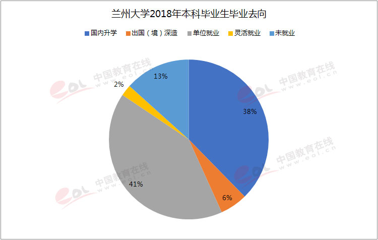 兰州大学2018届本科毕业生共有4473人,毕业去向以升学为主,其中国内升学人数占本科毕业生总数的37.63%;出国(境)深造人数占本科毕业生总数的5.57%。另外,单位就业人数占比41.13%,未就业人数占13.32%,灵活就业占比2.26%。