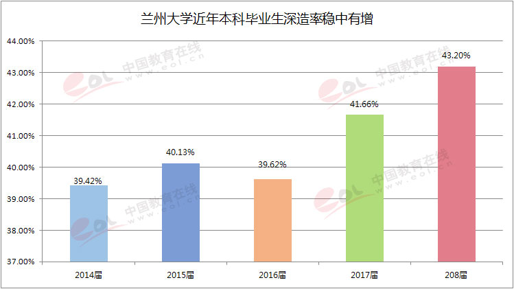本科毕业生深造率是人才培养质量、毕业生就业质量的重要指标。兰州大学本科毕业生继续深造率保持在40%左右,近年来稳中有增。