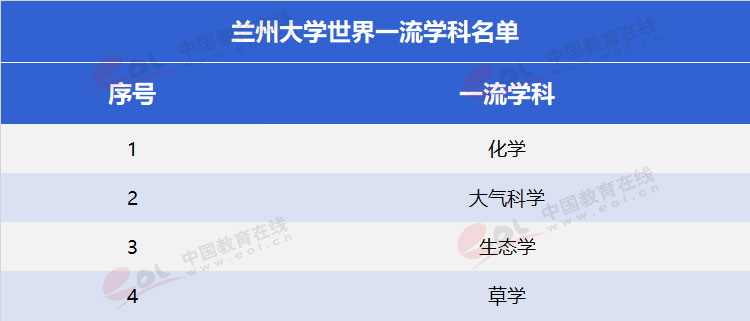 2017年,兰州大学成功入选“双一流”建设高校名单(A类),化学、大气科学、生态学、草学4个一流学科入选“世界一流学科”建设名单。
