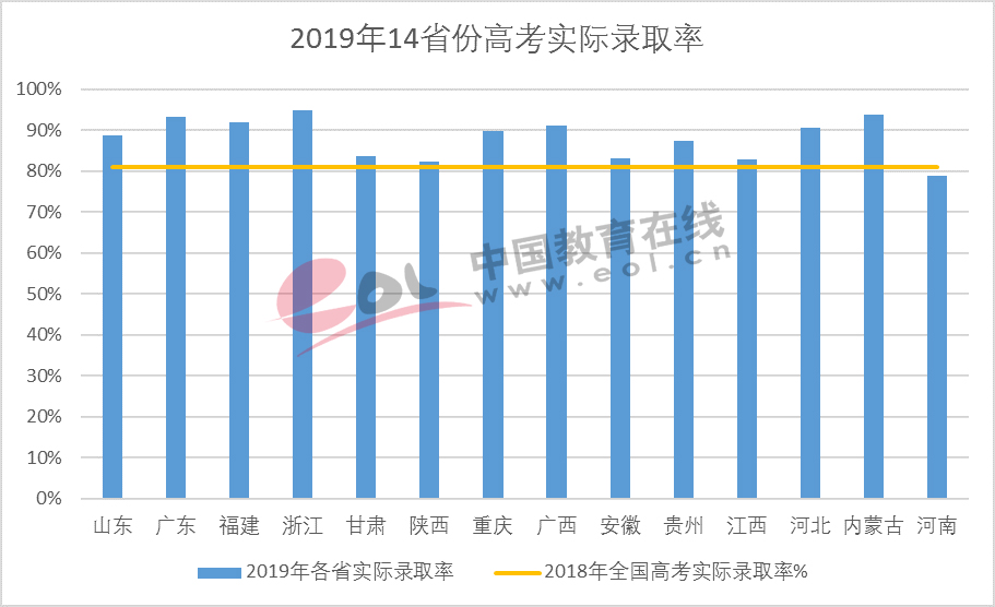 统计显示,今年大部分省份高考实际录取率继续保持高位,在已公布录取情况的14省份中,有6省区高考实际录取率超过90%,这些省份分别是:浙江、内蒙古、广东、福建、广西、河北。其中浙江高考实际录取率达到94.95%,为14个省份中最高。