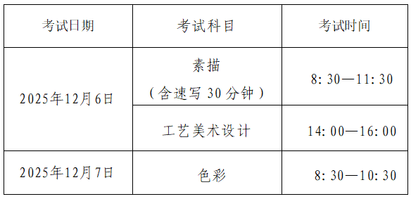 专业考试与普通高招美术与设计类专业省统考统一安排,考试时间安排如下: