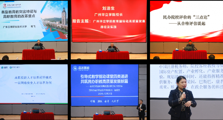 论坛中,广东民办职业教育领域的专家学者带来了精彩的主题演讲。广东工商职业技术大学校长和飞教授以《类型教育的突出特征与高职教育的改革重点》为题,从类型教育的特征、职业教育的知识特点和技能学习的本质、职业教育教学改革的重点等视角出发,深入剖析了高职教育的改革方向;广州华立学院校长刘洁生教授则分享了《广州华立学院教育国际化高质量发展路径及实践》。他指出教育国际化不仅能够拓宽学生的国际视野,提升学生的跨文化交流能力,民办高等院校要积极探索适合自身的教育国际化路径,加强与对外交流与合作,进一步凝练办学特色和办学水平;广州华商学院副校长范忠宝教授带来了题为《民办院校评价的‘三点论’——从合格评估谈起》的演讲。他从合格评估的角度出发,阐述了民办院校评价的“三点论”,为民办院校的评价提供了新的思路和方法;深圳奋达职业技术学校校长杨美杰则以《乘新时代东风,以引导式教学驱动课堂四类递进,共筑民办职教高质量发展新篇》为题,介绍了如何通过引导式教学推动课堂教学改革,提升教学效果。强调了以学生为中心的教学方法在激发学生学习兴趣和主动性、培养学生创新思维和实践能力方面的重要作用;深信服科技股份有限公司校企合作部主任吕沐阳则从企业角度分享了《高职技能人才培养闭环模式——以网络安全人才培养为例》。他介绍了深信服科技在校企合作培养网络安全人才方面的成功经验和做法,通过构建高职技能人才培养闭环模式,实现了学校、企业和学生的三方共赢。联合科讯控股股份有限公司总裁齐枝燕女士在会上分享了关于产教研创新驱动经济发展的见解,指出了这一模式对企业创新和社会经济发展的重要作用。
