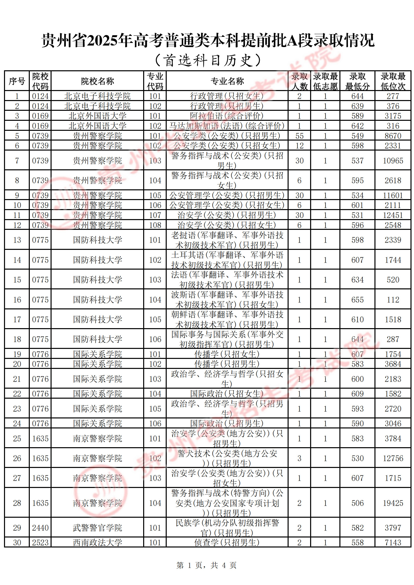 贵州省2025年高考普通类本科提前批A段录取情况(首选科目历史)已发布,具体内容如下: