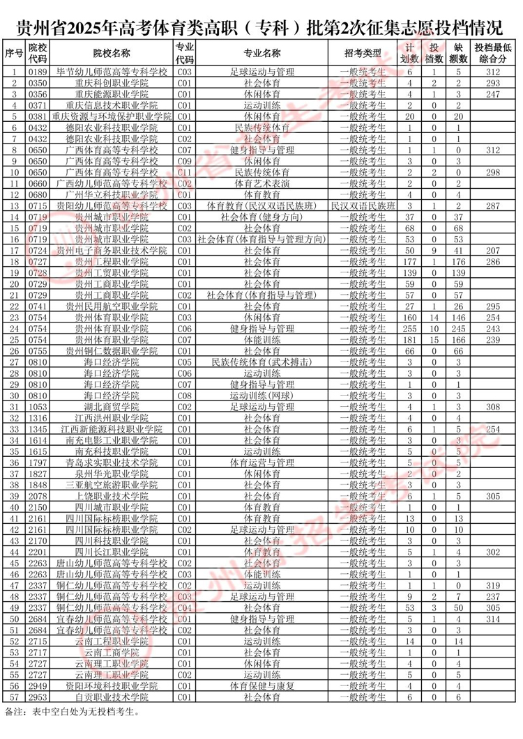 贵州省2025年高考体育类高职(专科)批第2次征集志愿投档情况已公布,具体内容如下: