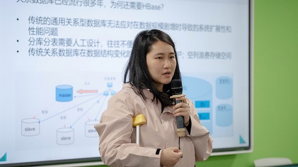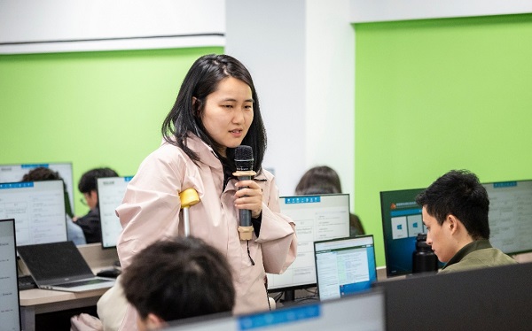 但如果仅仅是站在讲台上,夏老师对讲课效果仍不满意。因为夏老师任教的都是大数据技术相关的课程,很多都在机房上课,同学们的脸或多或少地被挡在了电脑后面。“隔着这么多电脑屏幕,不能看到同学们的表情,还是担心有同学没听懂。”于是她强忍着身体的不适,一讲解完关键知识点,就拄着拐杖,主动走近电脑屏幕后的同学们,仔细观察学生的实验操作、耐心解答学生们的疑惑。