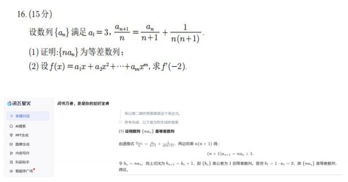 以解答题16题为例,这是一道偏中等难度的题目,涉及数列和函数相关的知识点,讯飞星火X1在回答中不仅得出了正确的结果,还给出了清晰明了的解题过程。