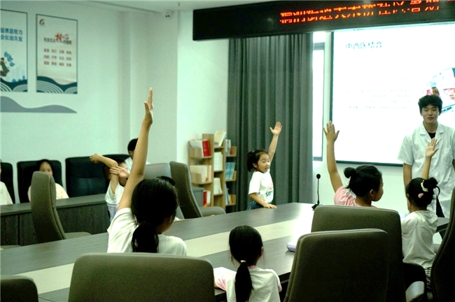 围绕“化学思政”这一核心,课程并未局限于知识的传授,而是引导孩子们思考科学与责任的关系。志愿者们提出“化学研究的意义是什么”“科学家为何要心怀家国”等问题,引发孩子们热烈讨论。这样的互动,让“严谨求实、爱国奉献”的科研精神悄然植根于孩子们心中。