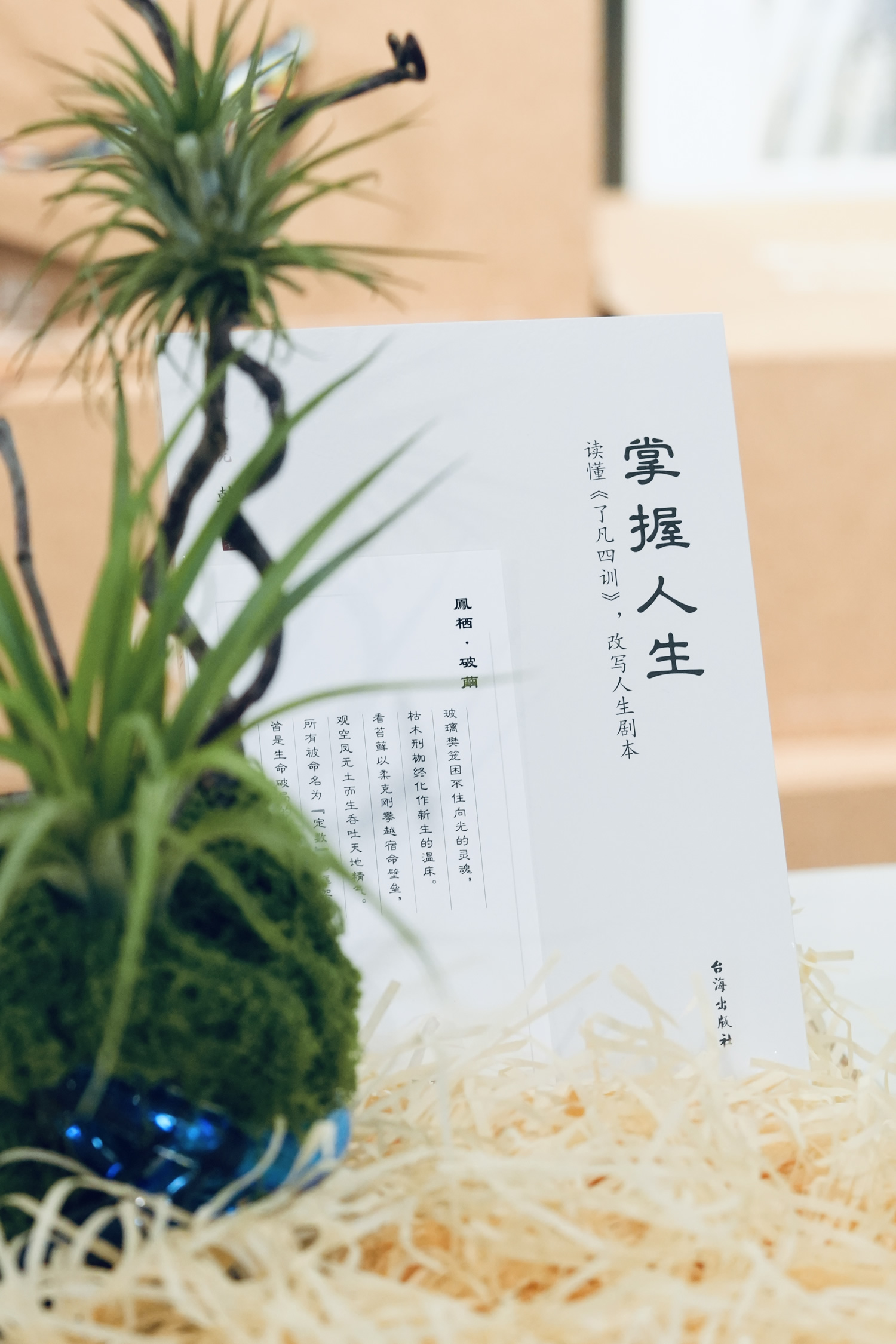 特别值得一提的是,在本次新书发布会上,与艺术结缘的元素,还包括由韩冰博士与觽堂植物艺术工作室芷仙坊联袂共创的花艺装置《人生自塑 枯木逢春》,成为现场视觉与哲学思考的焦点之一。该作品以枯木为骨,喻人生困境;以鲜花为冠,喻焕新之境;以空气凤梨为魂,象征不依外境、向内而生的精神。装置通过材料的碰撞与共生,艺术化呈现“从沉寂到绽放”的改命之路,生动诠释《了凡四训》“立命之学”中“命由我作,福自己求”的东方智慧,引领观者于草木枯荣间,照见自我新生的力量。