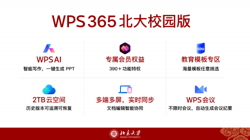 北大校园版WPS 365具备以下四大核心功能:其一,拥有北京大学专属开屏画面与模板空间,超6万份教育模板构成的丰富模板库,可充分满足师生日常学习与办公需求;其二,提供涵盖写作、阅读、设计和数据领域的WPS AI助手,更有最新发布的原生Office办公智能体——WPS灵犀,让每位师生都仿如拥有了“专属AI助手”;其三,支持500人同时参会的不限时视频会议,会议期间师生可协作编辑共享文档,会后还能自动生成AI纪要;其四,具备人均2T的超大云空间,以及自动抠取人像、文字等实用功能。