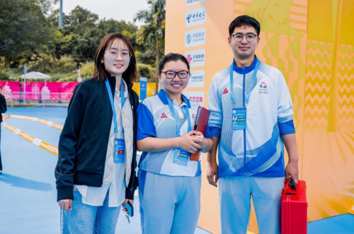 张媛(左二)、孙振康(右一)保障赛事间隙合影留念