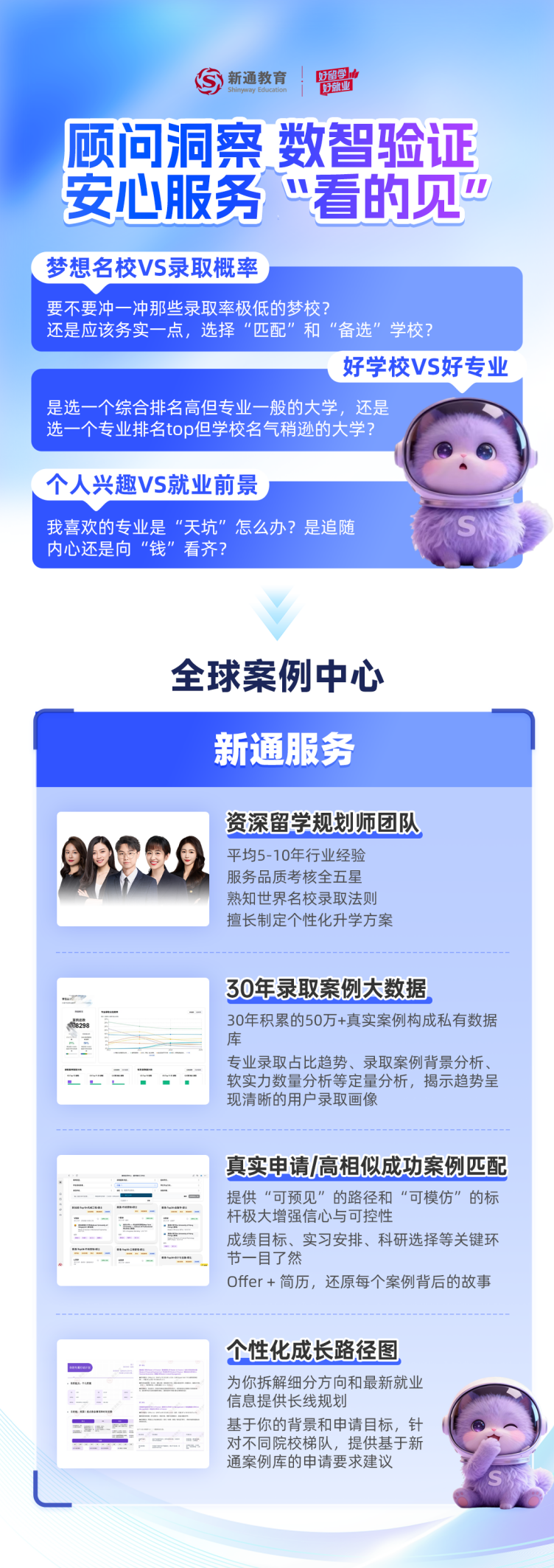 • 全球案例中心:以新通30年行业数据积淀、超50万真实学子案例及资深顾问经验为核心支撑,支持精准检索与智能匹配,可结合学生个性化背景与目标,清晰呈现多维度对比方案,助力选校决策更科学、精准。