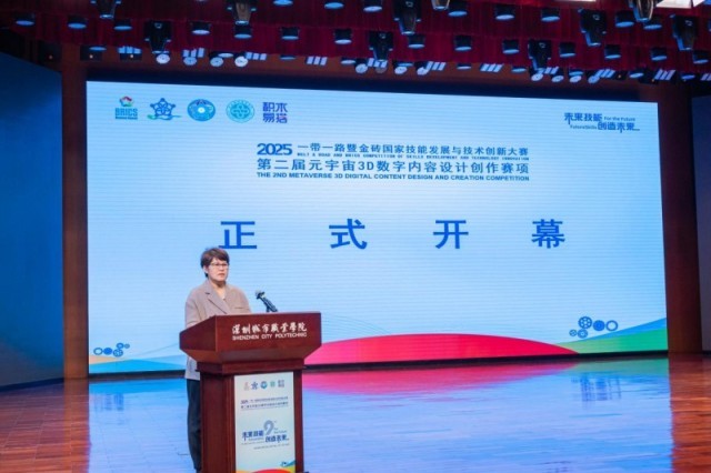 深圳城市职业学院(深圳技师学院)副校长朱爱群代表大赛承办校发表致辞,朱校长首先代表深圳城市职业学院(深圳技师学院)欢迎领导、嘉宾和参赛队师生的到来,感谢组委会和合作单位。她指出,数字技术重塑世界格局,金砖国家持续深化技能发展与技术创新合作是应对时代挑战的关键,大赛聚焦元宇宙3D数字内容创作,既精准契合了数字经济需求,深化金砖国家之间技能交流与人才共享的生动实践。大赛为广大技能青年人才搭建展示才华、切磋技艺的国际化舞台,学校承诺将周密组织、完善保障和热情服务,确保赛事公平、有序、高效开展。预祝选手取得佳绩、大赛圆满成功。