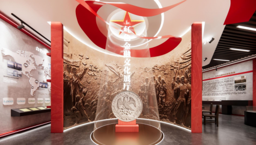 序厅以红色五星与飘带造型营造仪式氛围,卷轴式浮雕墙依次铺陈农民合作社、边币、数字人民币等符号,地面投射“星火燎原”粒子动画,参观者一步入馆即完成从“学生”到“红色金融接班人”的身份转换。高1.949米“工字银元”雕塑内嵌NFC芯片,手机轻触即可下载电子研学手册,实现实体空间与数字入口双轨启动,为后续深度学习奠定情感基调。
