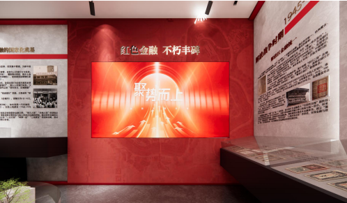 历史展示区以“近代—现当代”双时间轴展开,墙面规则化切割与暗藏灯带形成“一步一史”节奏:大革命时期“白竹布币”微缩场景、土地革命时期“工字银元”熔铸台、解放战争时期“中国人民银行成立”石家庄旧址模型依次排布,配合3—5分钟概念宣传片,使学生在纵向时间轴中完成“历史—今天”镜像对照。主题展区并列钱币、图书、人物三大专题:钱币展以“币材与工艺—图案寓意—流通故事”三重解读,将桑皮纸抗磨损技术、耕者有其田符号、跨封锁线交换故事层层展开;图书展设置“文献对比墙”,把1932年《中华苏维埃共和国国家银行章程》与现行普惠金融政策并置;人物展以“名人墙+二维码语音+触摸屏”还原毛泽民、董必武、南汉宸、曹菊如等先驱在“无固定办公地、缺专业人才”条件下建立金融网络的细节,实现“看—思—悟”递进。