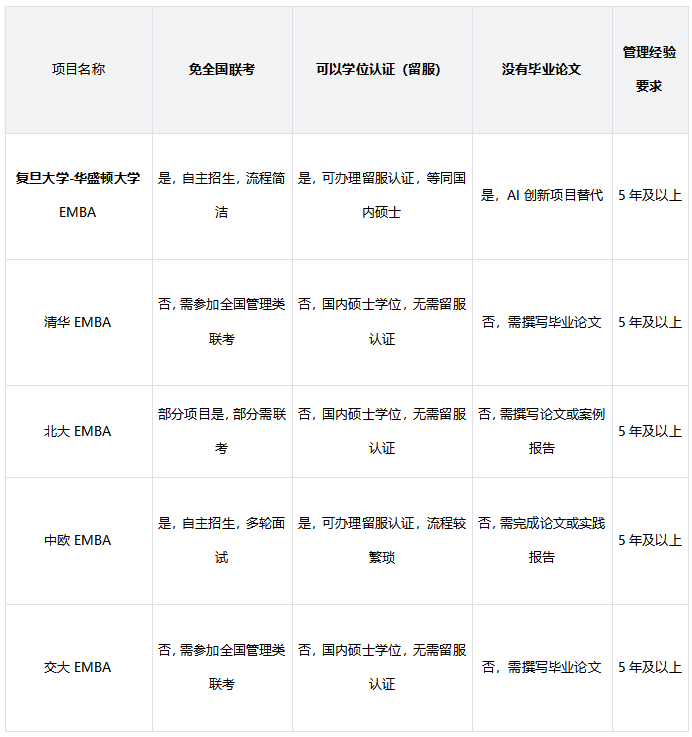 对于职场精英而言,日常工作繁琐、时间碎片化,备战全国联考需投入大量精力,往往陷入“想提升却无时间备考”的困境。这一维度下,复旦大学-华盛顿大学EMBA的政策优势尤为突出,具体对比如下: