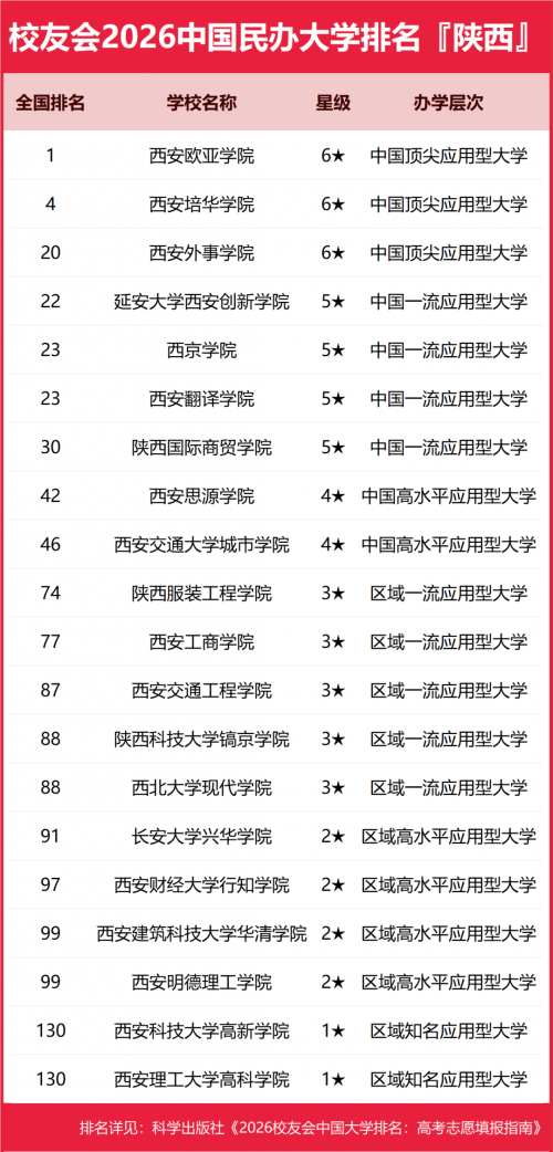 2026陕西省民办二本大学排名(校友会版)