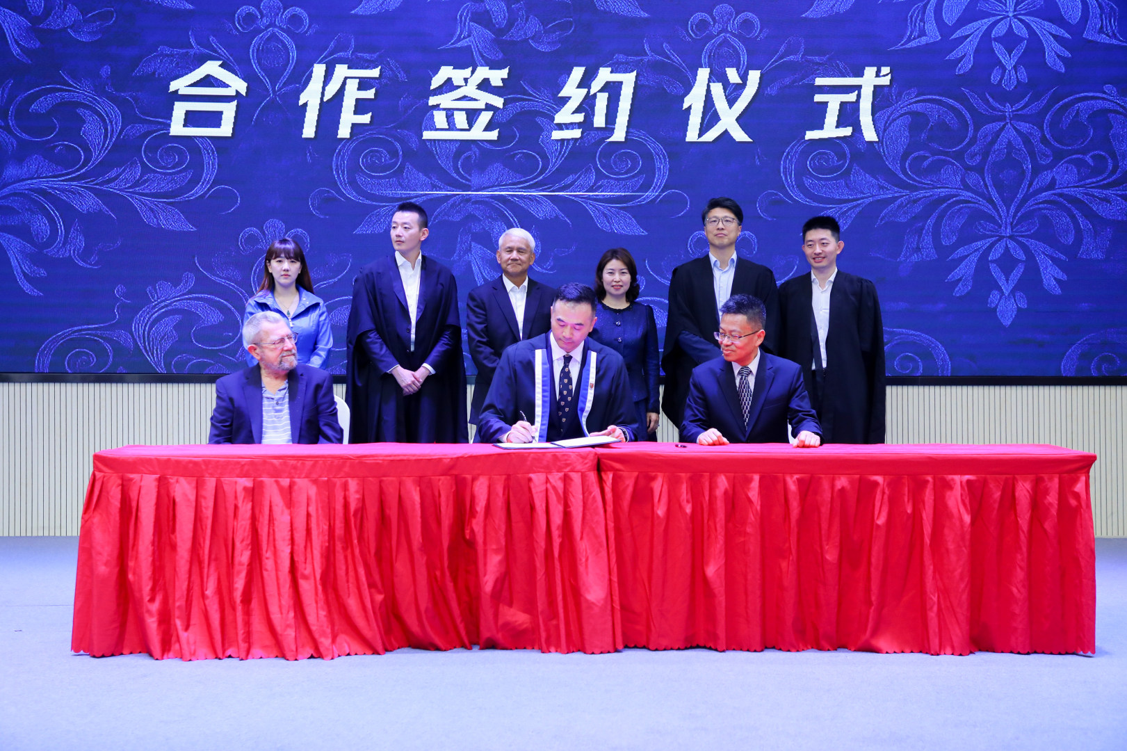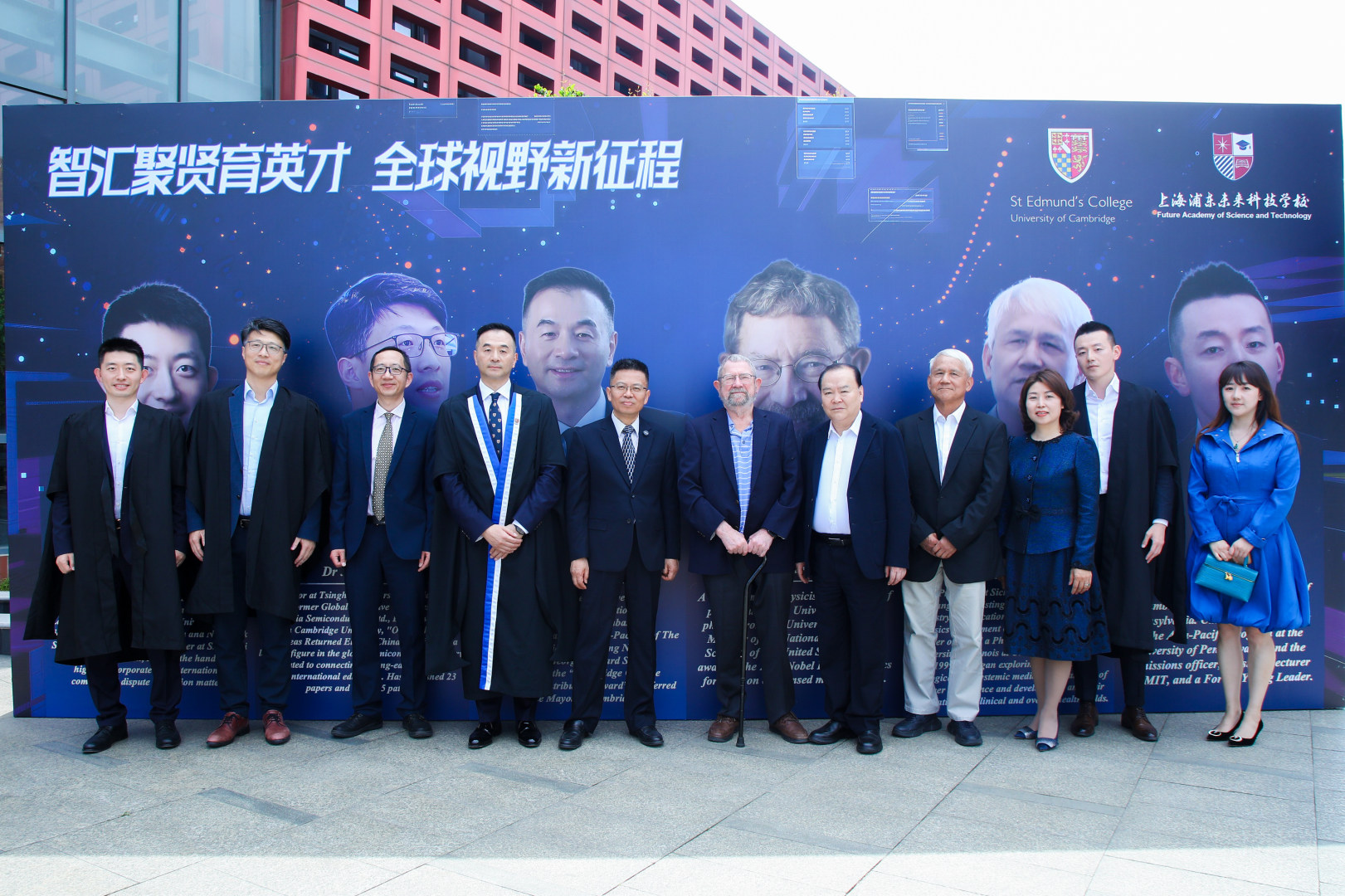 随后,上海浦东未来科技学校张雪飞校长与剑桥大学圣埃德蒙学院刘伟院士共同移步签约台,在2016年诺贝尔物理学奖得主J. Michael Kosterlitz教授、马梅理事长、敖平教授、姜克博士及王储先生、Nathan Wu 先生、吴汶芹女士等中外嘉宾的共同见证下,郑重签署合作协议,签约仪式结束后,双方代表合影留念。