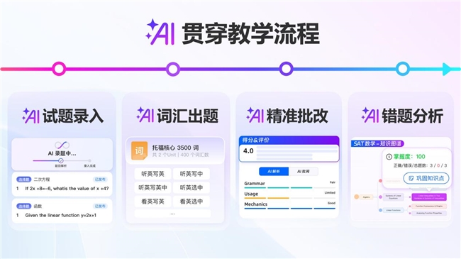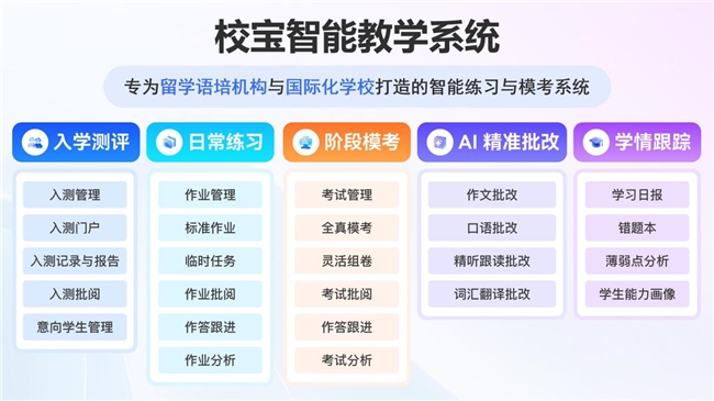 依托十余年语培技术积累与AI大模型技术突破,校宝打造独有的语培垂类技术优势,AI贯穿试题录入、词汇出题、智能批改、错题分析全流程。