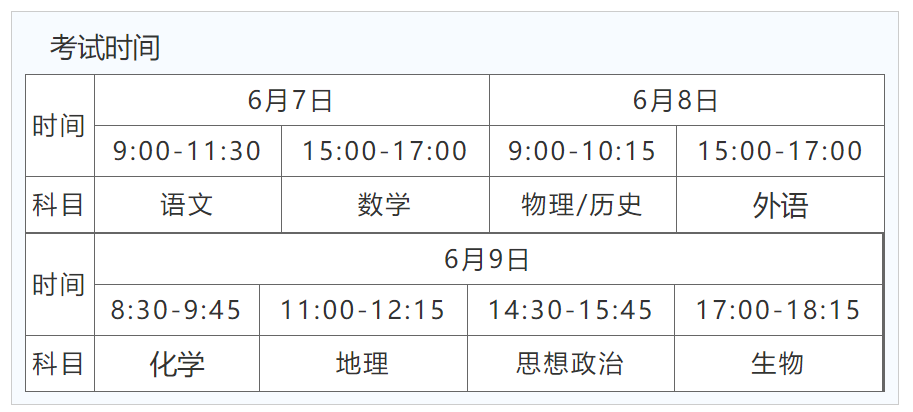 高考总共有3天,从6月7日开始,至6月9日结束。