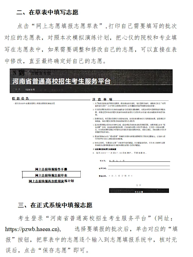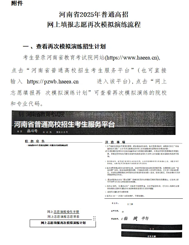 2.6月12日9时至13日17时,考生登录河南省普通高校招生考生服务平台进行网上填报志愿再次模拟演练,志愿填报具体流程见附件。