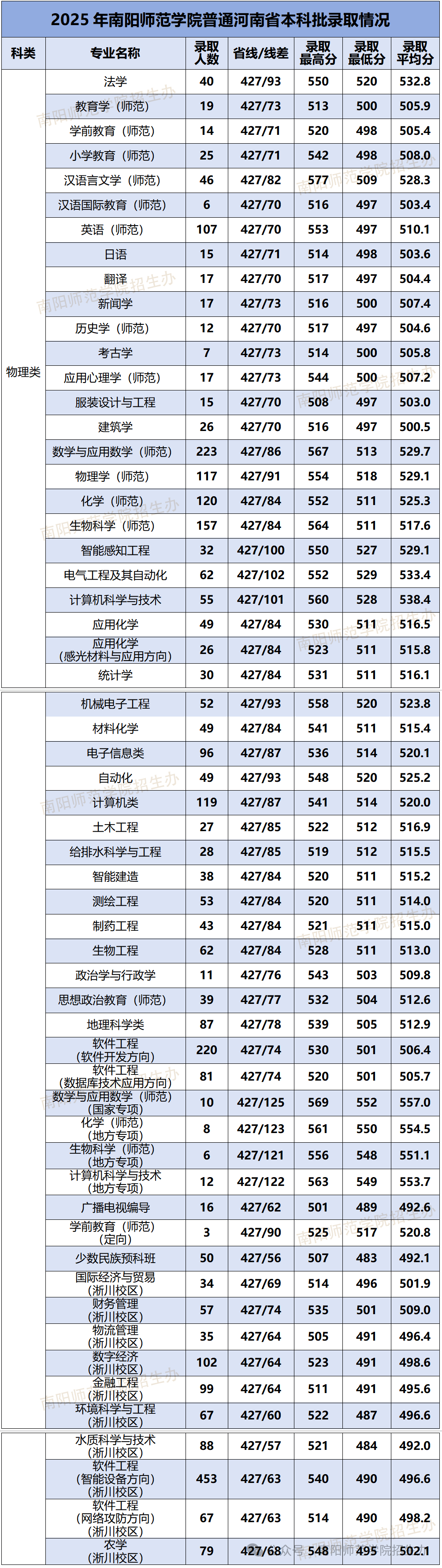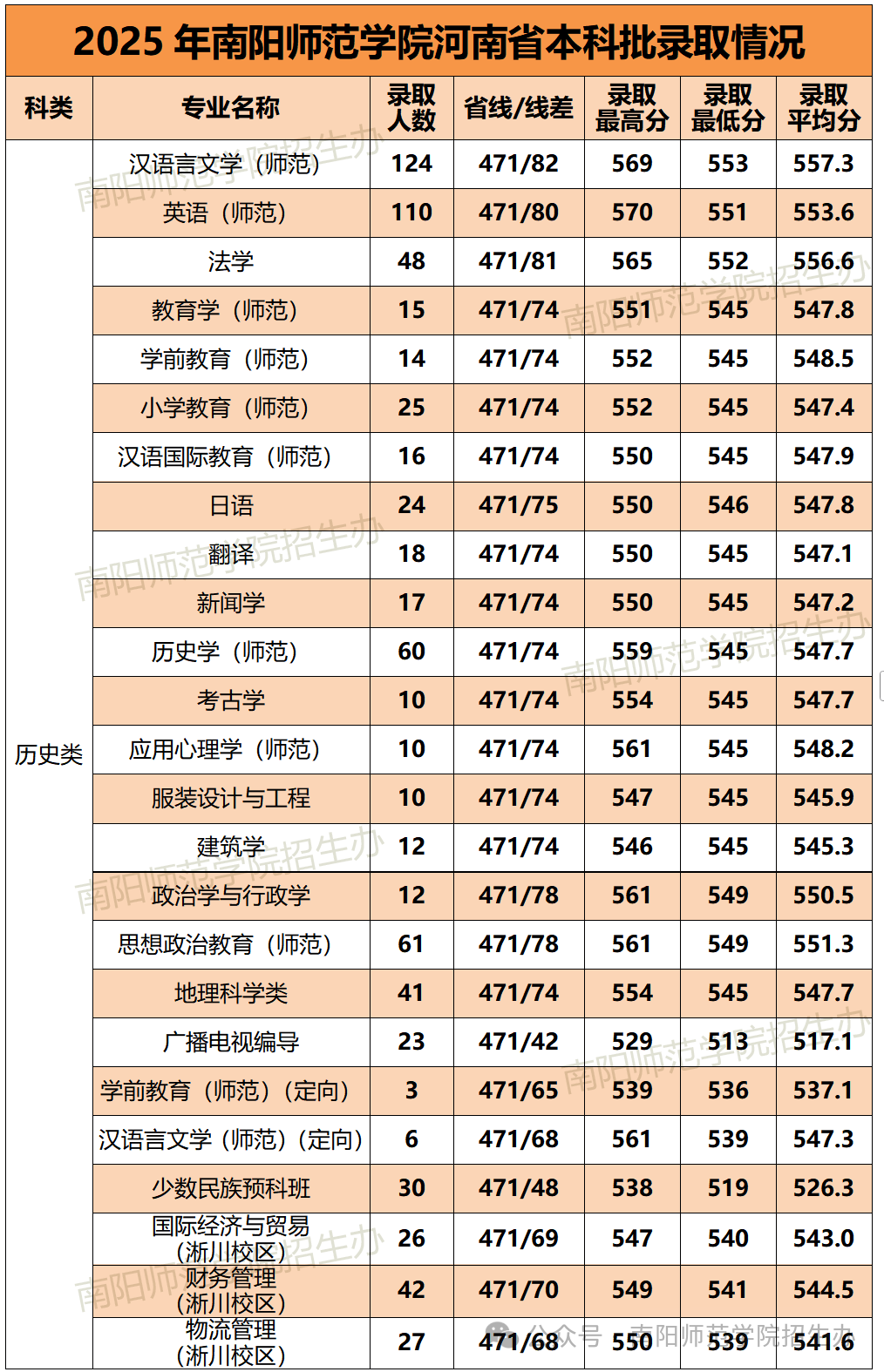 南阳师范学院2025年在河南录取分数线汇总