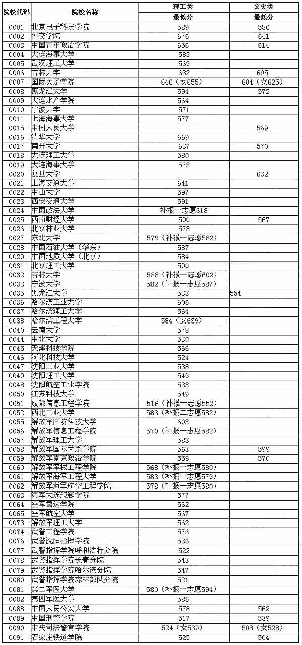 2006年普通高校黑龙江省最低录取分数(提前录取) |
