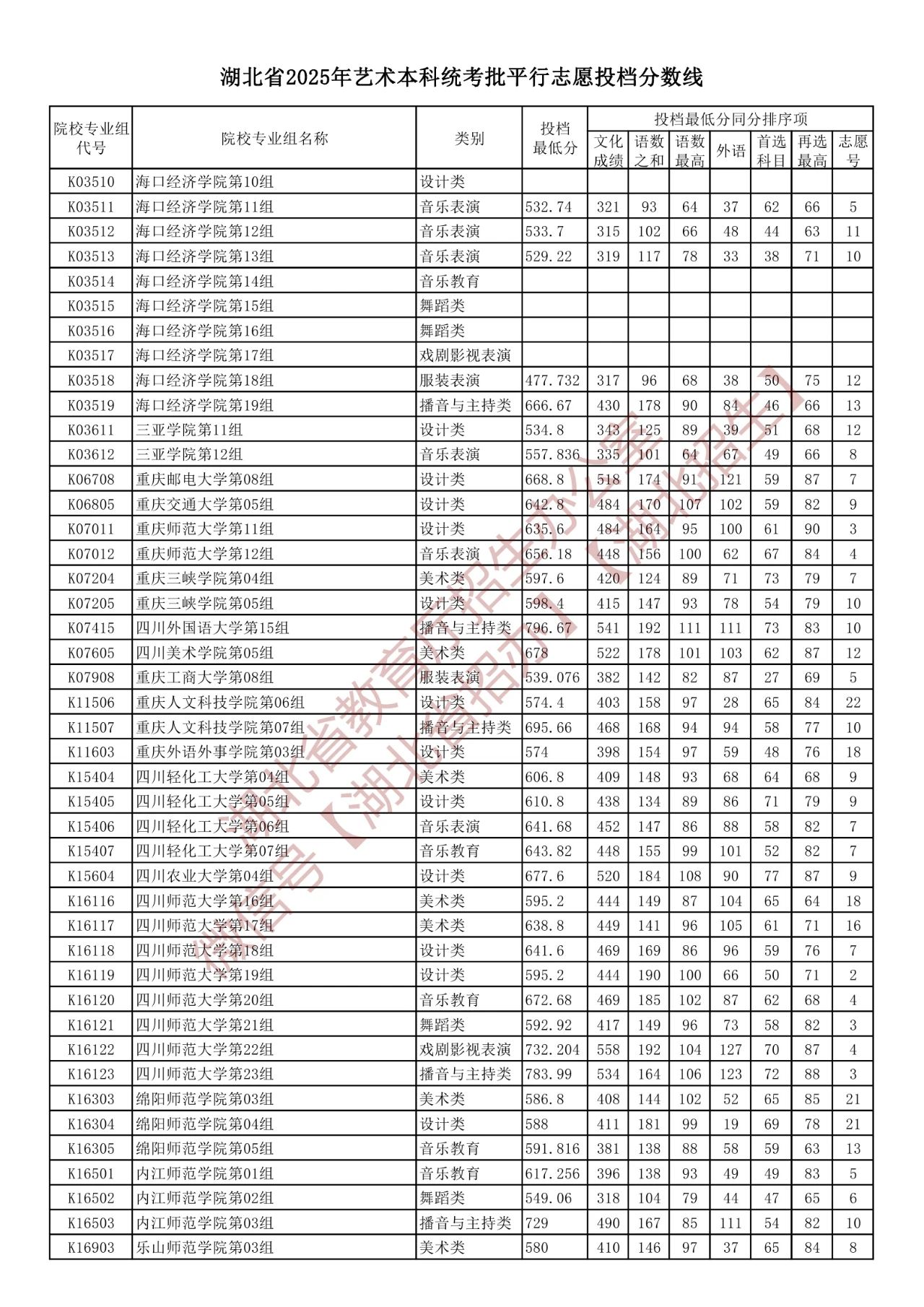 湖北省2025年艺术本科统考批平行志愿投档分数线