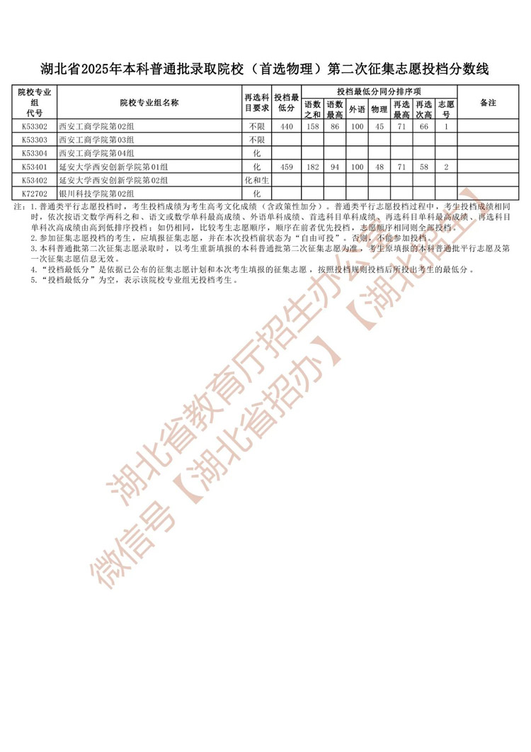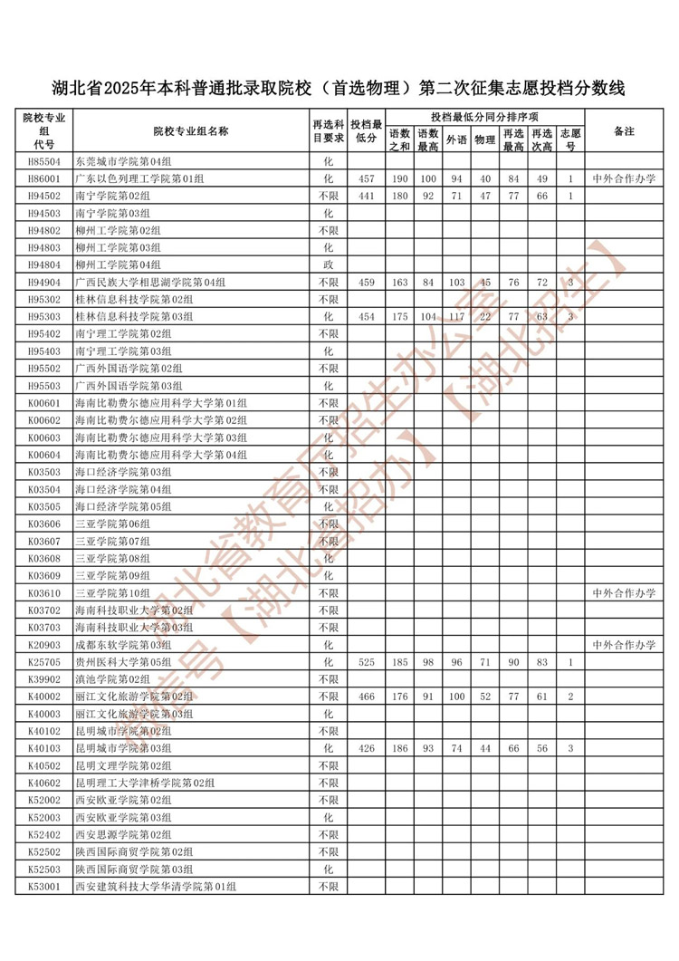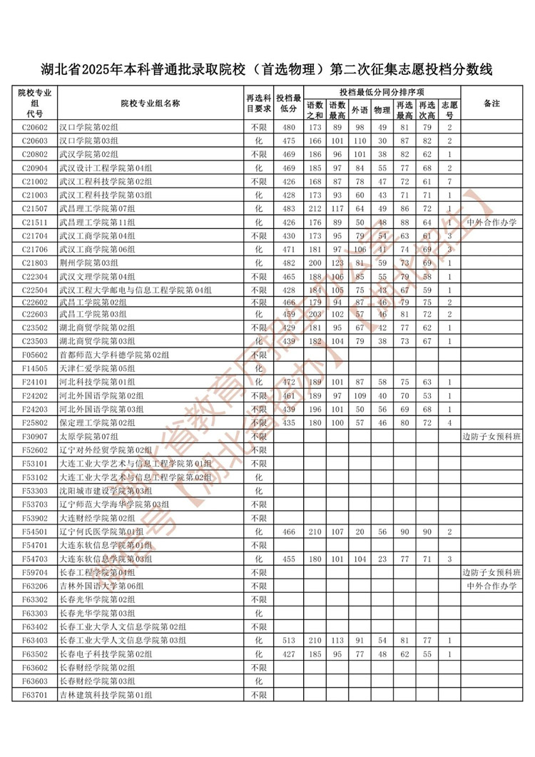湖北省2025年本科普通批录取院校(首选物理)第二次征集志愿投档分数线已公布,具体内容如下: