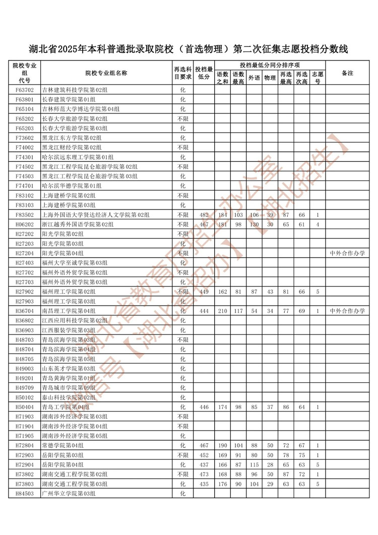 湖北省2025年本科普通批录取院校(首选物理)第二次征集志愿投档分数线