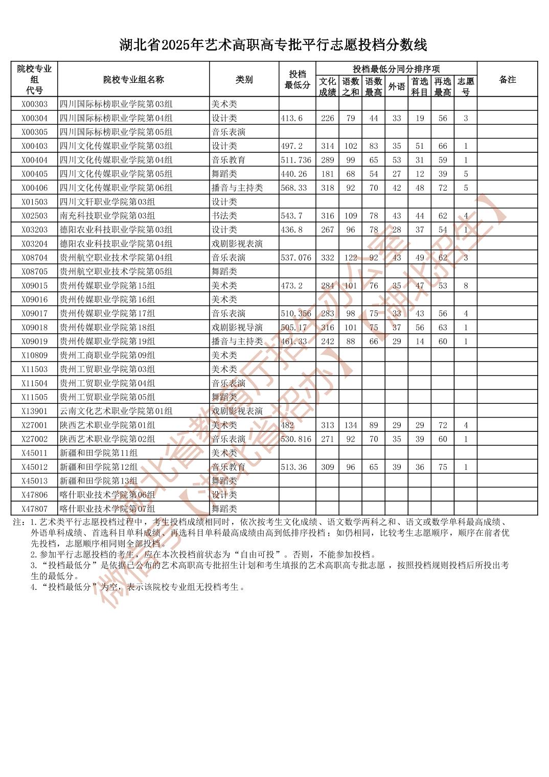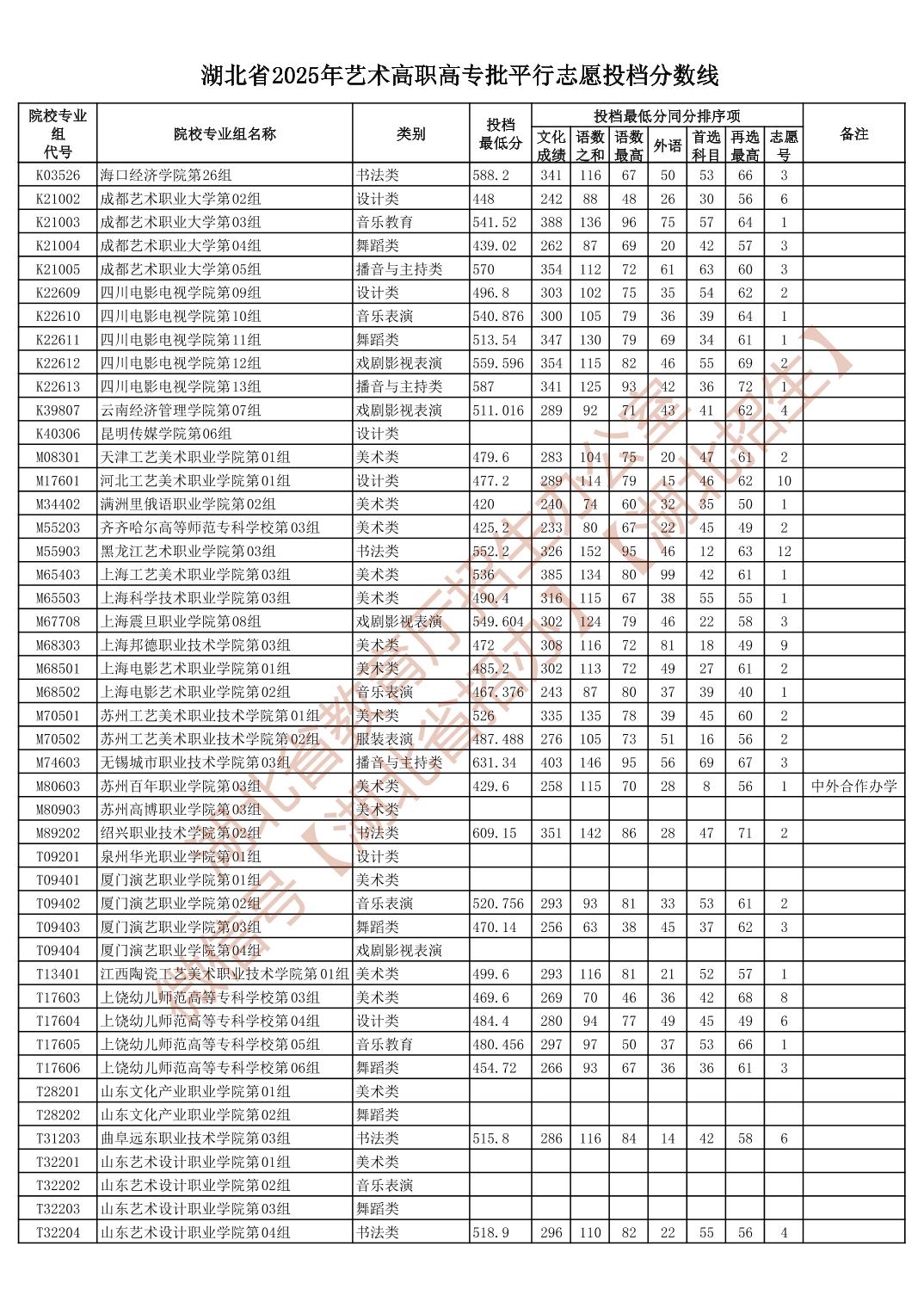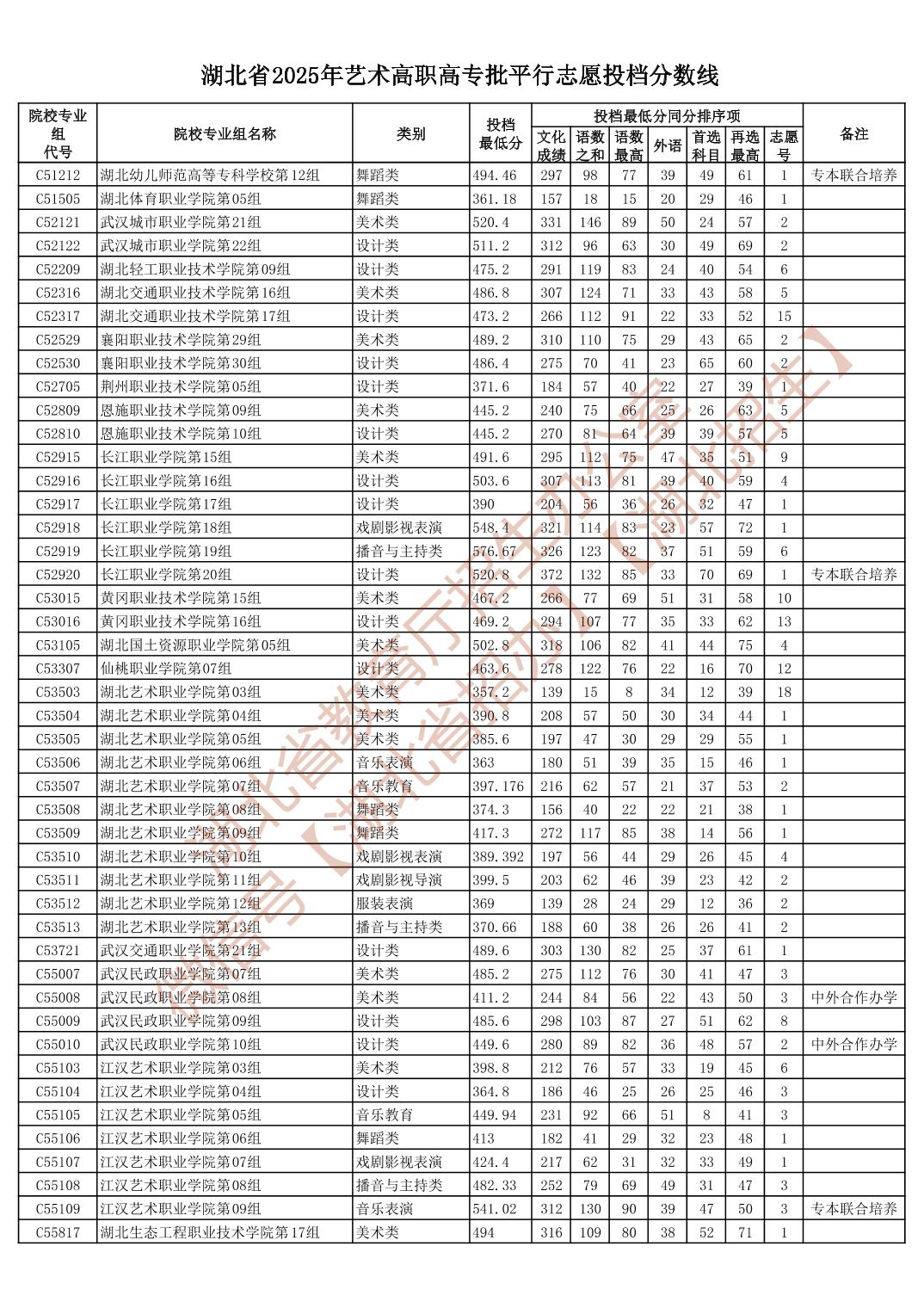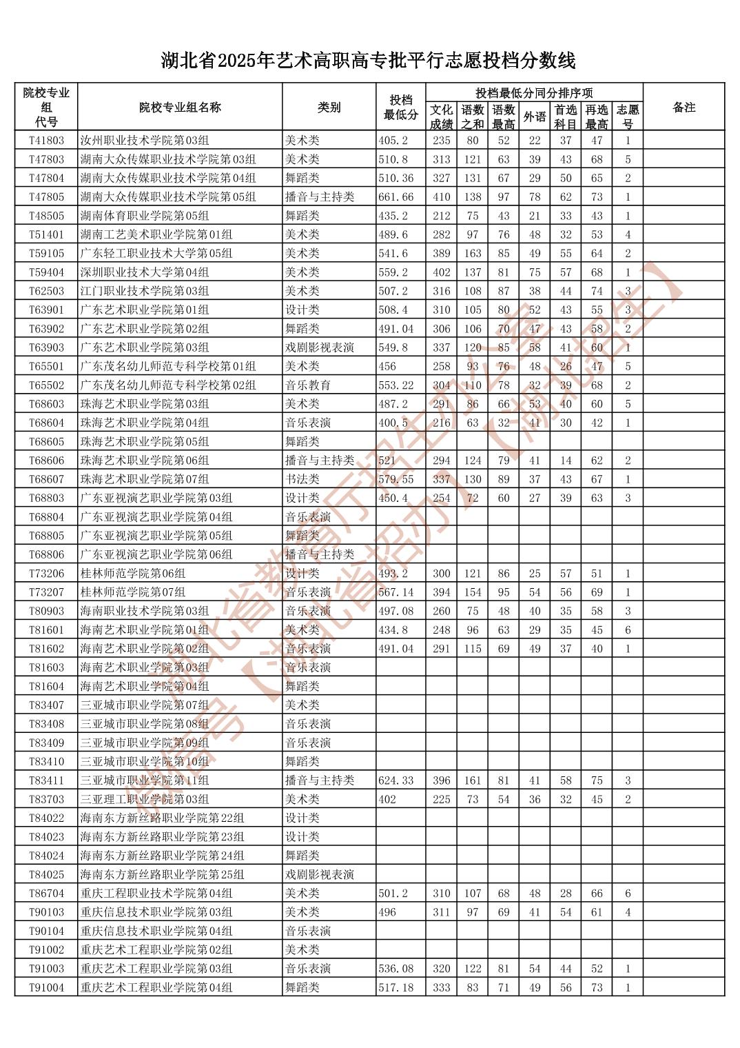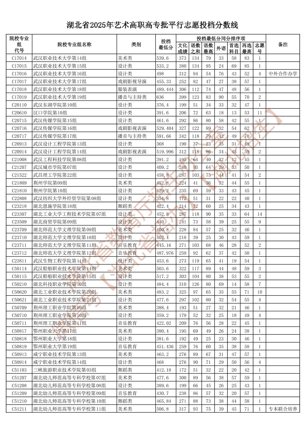 湖北省2025年艺术高职高专批平行志愿投档分数线已发布,具体内容如下: