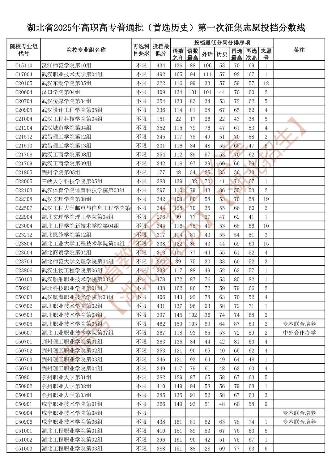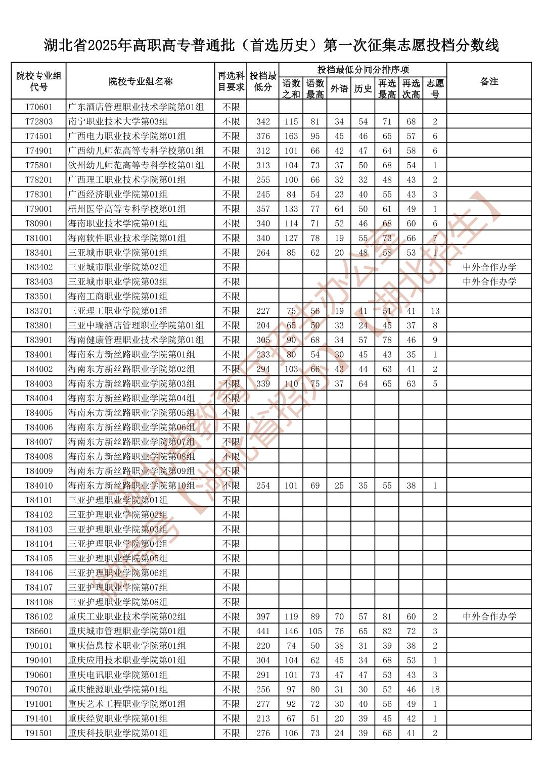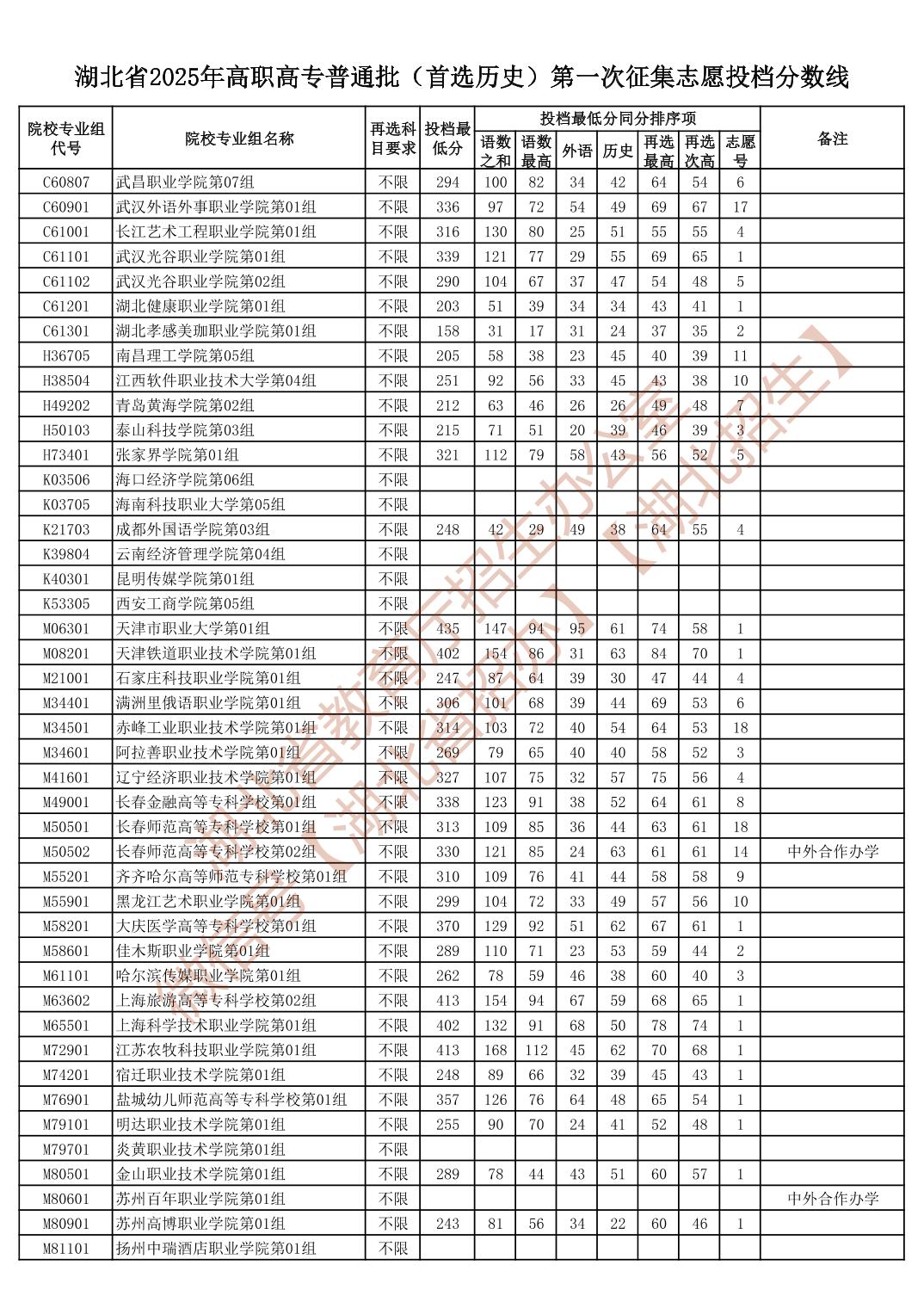 湖北省2025年高职高专普通批(首选历史)第一次征集志愿投档分数线已发布,具体内容如下:
